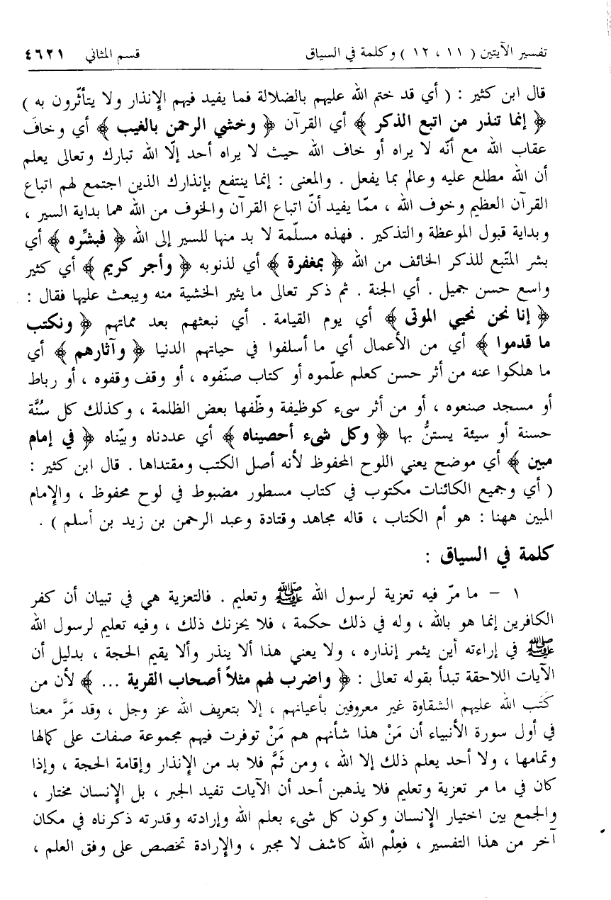 إِنَّما تُنْذِرُ مَنِ اتَّبَعَ الذِّكْرَ أي القرآن وَخَشِيَ الرَّحْمنَ بِالْغَيْبِ أي وخاف عقاب الله مع أنّه لا يراه أو خاف الله حيث لا يراه أحد إلّا الله تبارك وتعالى يعلم أن الله مطلع عليه وعالم بما يفعل. والمعنى: إنما ينتفع بإنذارك الذين اجتمع لهم اتباع القرآن العظيم وخوف الله، ممّا يفيد أنّ اتباع القرآن والخوف من الله هما بداية السير، وبداية قبول الموعظة والتذكير. فهذه مسلّمة لا بد منها للسير إلى الله فَبَشِّرْهُ أي بشر المتّبع للذكر الخائف من الله بِمَغْفِرَةٍ أي لذنوبه وَأَجْرٍ كَرِيمٍ أي كثير واسع حسن جميل. أي الجنة.