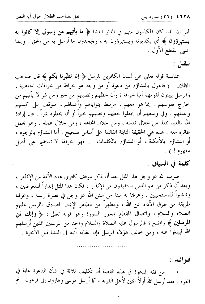 بمناسبة قوله تعالى على لسان الكافرين للرسل إِنَّا تَطَيَّرْنا بِكُمْ قال صاحب الظلال: (فالقول بالتشاؤم من دعوة أو من وجه هو خرافة من خرافات الجاهلية.