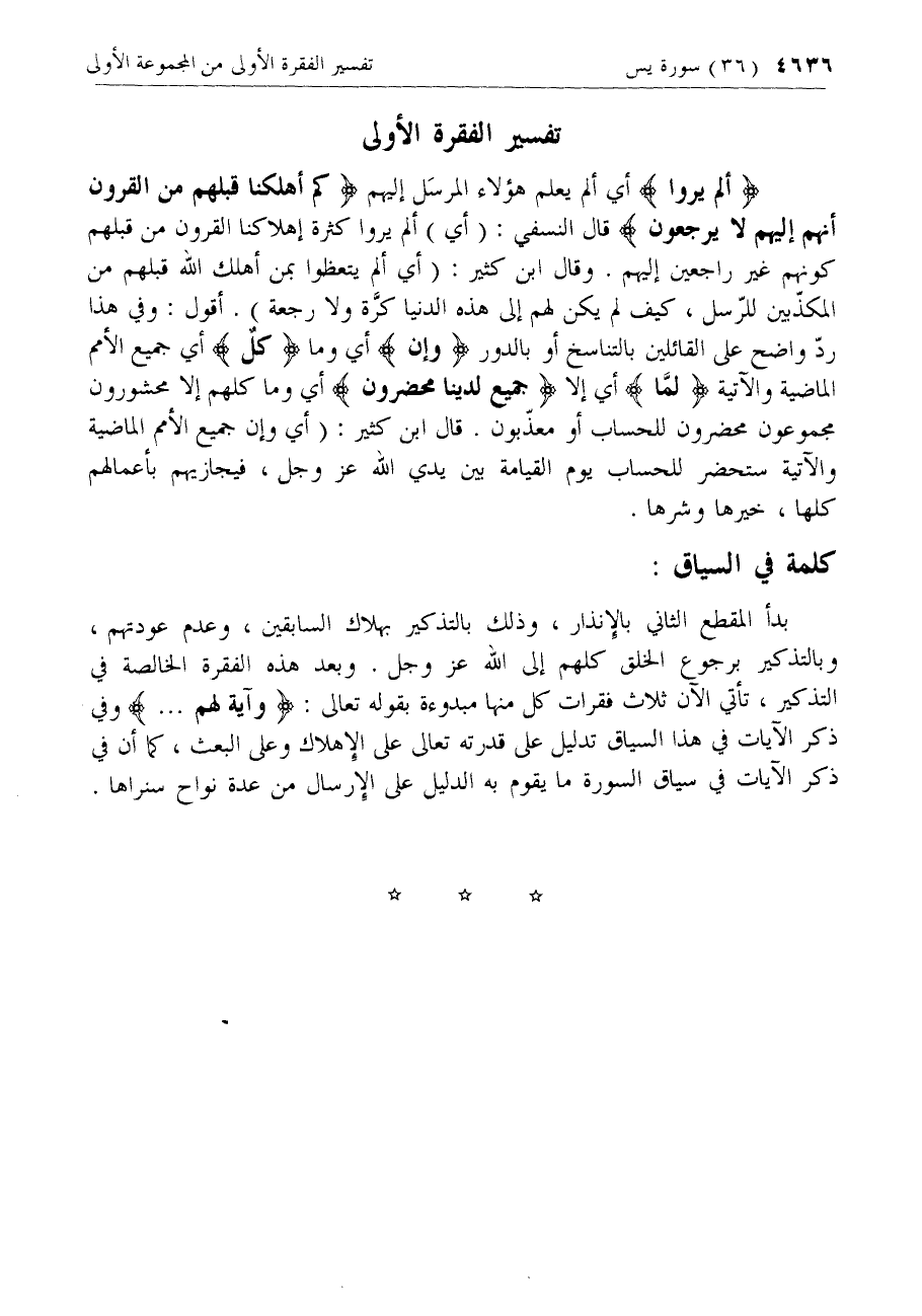 أَلَمْ يَرَوْا أي ألم يعلم هؤلاء المرسل إليهم كَمْ أَهْلَكْنا قَبْلَهُمْ مِنَ الْقُرُونِ أَنَّهُمْ إِلَيْهِمْ لا يَرْجِعُونَ قال النسفي: (أي) ألم يروا كثرة إهلاكنا القرون من قبلهم كونهم غير راجعين إليهم. وقال ابن كثير: (أي ألم يتعظوا بمن أهلك الله قبلهم من المكذّبين للرّسل، كيف لم يكن لهم إلى هذه الدنيا كرّة ولا رجعة). أقول: وفي هذا ردّ واضح على القائلين بالتناسخ أو بالدور