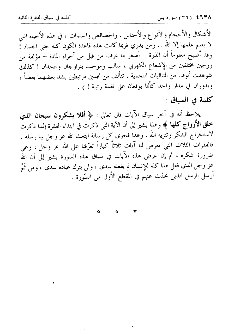 الأشكال والأحجام والأنواع والأجناس، والخصائص والسمات، في هذه الأحياء التي لا يعلم علمها إلا الله .. ومن يدري فربما كانت هذه قاعدة الكون كله حتى الجماد! وقد أصبح معلوما أن الذرة- أصغر ما عرف من قبل من أجزاء المادة- مؤلفة من زوجين مختلفين من الإشعاع الكهربي، سالب وموجب يتزاوجان ويتحدان! كذلك شوهدت ألوف من الثنائيات النجمية. تتألف من نجمين مرتبطين يشد بعضهما بعضا، ويدوران في مدار واحد كأنما يوقعان على نغمة رتيبة!).