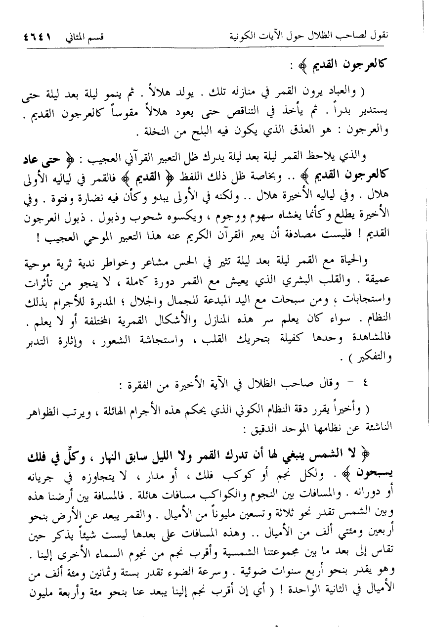 والذي يلاحظ القمر ليلة بعد ليلة يدرك ظل التعبير القرآني العجيب: حَتَّى عادَ كَالْعُرْجُونِ الْقَدِيمِ .. وبخاصة ظل ذلك اللفظ الْقَدِيمِ فالقمر في لياليه الأولى هلال. وفي لياليه الأخيرة هلال .. ولكنه في الأولى يبدو وكأن فيه نضارة وفتوة. وفي الأخيرة يطلع وكأنما يغشاه سهوم ووجوم، ويكسوه شحوب وذبول. ذبول العرجون القديم! فليست مصادفة أن يعبر القرآن الكريم عنه هذا التعبير الموحي العجيب!