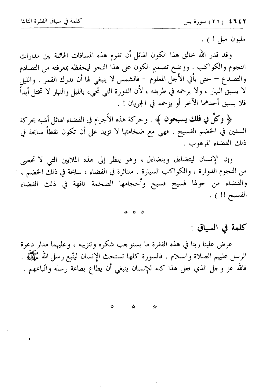 وَكُلٌّ فِي فَلَكٍ يَسْبَحُونَ. وحركة هذه الأجرام في الفضاء الهائل أشبه بحركة السفين في الخضم الفسيح. فهي مع ضخامتها لا تزيد على أن تكون نقطا سابحة في ذلك الفضاء المرهوب.