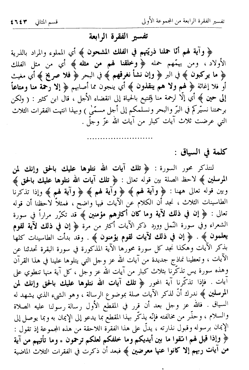 لنتذكر محور السورة: تِلْكَ آياتُ اللَّهِ نَتْلُوها عَلَيْكَ بِالْحَقِّ وَإِنَّكَ لَمِنَ الْمُرْسَلِينَ لاحظ الصلة بين قوله تعالى: تِلْكَ آياتُ اللَّهِ نَتْلُوها عَلَيْكَ بِالْحَقِّ وبين قوله تعالى هاهنا: وَآيَةٌ لَهُمُ وَآيَةٌ لَهُمُ وَآيَةٌ لَهُمْ وإذا تذكرنا الطاسينات الثلاث، نجد أن الكلام عن الآيات فيها واضح، فمثلا لاحظنا أن قوله تعالى: إِنَّ فِي ذلِكَ لَآيَةً وَما كانَ أَكْثَرُهُمْ مُؤْمِنِينَ* قد تكرّر مرارا في سورة الشعراء وفي سورة النّمل وورد ذكر الآيات أكثر من مرة إِنَّ فِي ذلِكَ لَآيَةً لِقَوْمٍ يَعْلَمُونَ. إِنَّ فِي ذلِكَ لَآياتٍ لِقَوْمٍ يُؤْمِنُونَ.* وقد بدأت الطاسينات كلها بذكر الآيات وهكذا نجد كل سورة محورها الآية المذكورة في سورة البقرة تحدثنا عن الآيات، وتعطينا نماذج جديدة من آيات الله عزّ وجل التي يتلوها علينا في هذا القرآن وهذه سورة يس تذكّرنا بثلاث كبار من آيات الله عزّ وجل، كل آية منها تنطوي على آيات. فإذا تذكّرنا آية المحور تِلْكَ آياتُ اللَّهِ نَتْلُوها عَلَيْكَ بِالْحَقِّ وَإِنَّكَ لَمِنَ الْمُرْسَلِينَ ندرك أنّ لذكر الآيات صلة بموضوع الرسالة، وهو الشئ الذي يشهد له السياق. فالله عزّ وجل بعد أن قرر في المقطع الأول رسالة رسولنا عليه الصلاة والسلام، وحذّر من مخالفته فإنّه يذكّر بهذا المقطع بما يدعو إلى الإيمان به وبما يوصل إلى الإيمان برسوله وقبول نذارته، يدلّ على هذا الفقرة اللاحقة من هذه المجموعة إذ تقول: