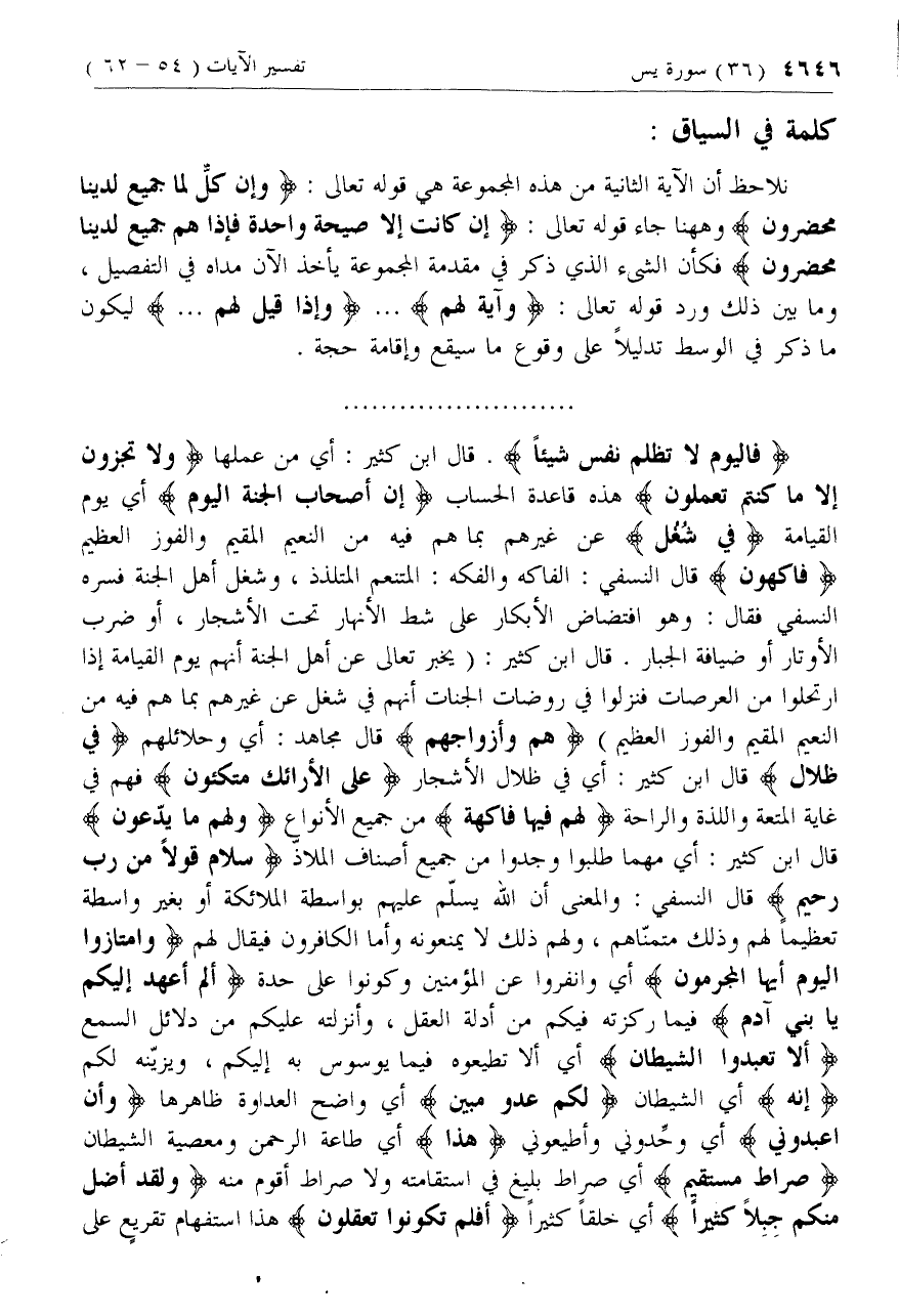 نلاحظ أن الآية الثانية من هذه المجموعة هي قوله تعالى: وَإِنْ كُلٌّ لَمَّا جَمِيعٌ لَدَيْنا مُحْضَرُونَ وهاهنا جاء قوله تعالى: إِنْ كانَتْ إِلَّا صَيْحَةً واحِدَةً فَإِذا هُمْ جَمِيعٌ لَدَيْنا مُحْضَرُونَ فكأن الشئ الذي ذكر في مقدمة المجموعة يأخذ الآن مداه في التفصيل، وما بين ذلك ورد قوله تعالى: وَآيَةٌ لَهُمْ ... وَإِذا قِيلَ لَهُمُ ... ليكون ما ذكر في الوسط تدليلا على وقوع ما سيقع وإقامة حجة.