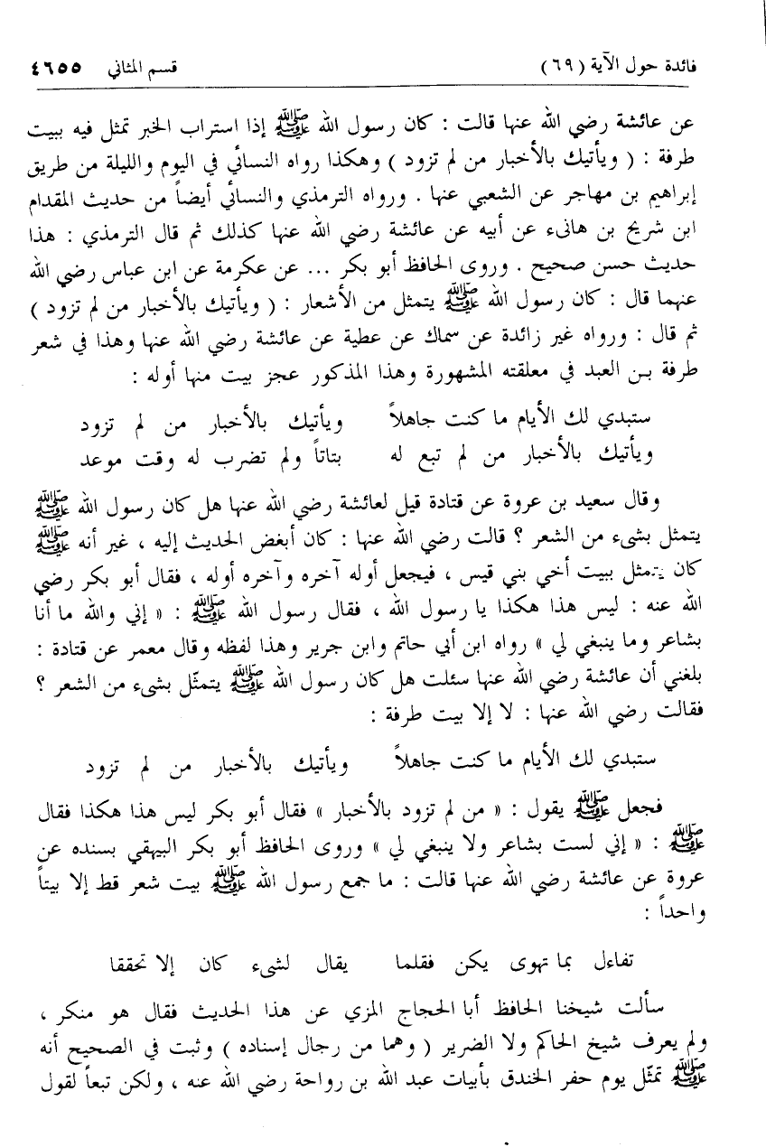 وقال سعيد بن عروة عن قتادة قيل لعائشة رضي الله عنها هل كان رسول الله صلّى الله عليه وسلم يتمثل بشيء من الشعر؟ قالت رضي الله عنها: كان أبغض الحديث إليه، غير أنه صلّى الله عليه وسلم كان يتمثل ببيت أخي بني قيس، فيجعل أوله آخره وآخره أوله، فقال أبو بكر رضي الله عنه: ليس هذا هكذا يا رسول الله، فقال رسول الله صلّى الله عليه وسلم: «إني والله ما أنا بشاعر وما ينبغي لي» رواه ابن أبي حاتم وابن جرير وهذا لفظه وقال معمر عن قتادة: