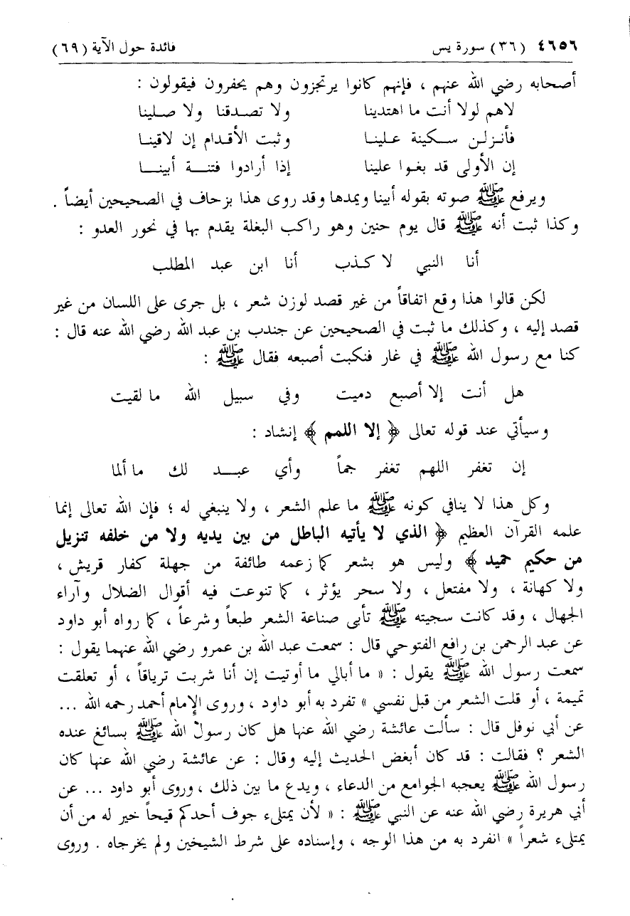 وكل هذا لا ينافي كونه صلّى الله عليه وسلم ما علم الشعر، ولا ينبغي له؛ فإن الله تعالى إنما علمه القرآن العظيم الذي لا يَأْتِيهِ الْباطِلُ مِنْ بَيْنِ يَدَيْهِ وَلا مِنْ خَلْفِهِ تَنْزِيلٌ مِنْ حَكِيمٍ حَمِيدٍ وليس هو بشعر كما زعمه طائفة من جهلة كفار قريش، ولا كهانة، ولا مفتعل، ولا سحر يؤثر، كما تنوعت فيه أقوال الضلال وآراء الجهال، وقد كانت سجيته صلّى الله عليه وسلم تأبى صناعة الشعر طبعا وشرعا، كما رواه أبو داود عن عبد الرحمن بن رافع الفتوحي قال: سمعت عبد الله بن عمرو رضي الله عنهما يقول: