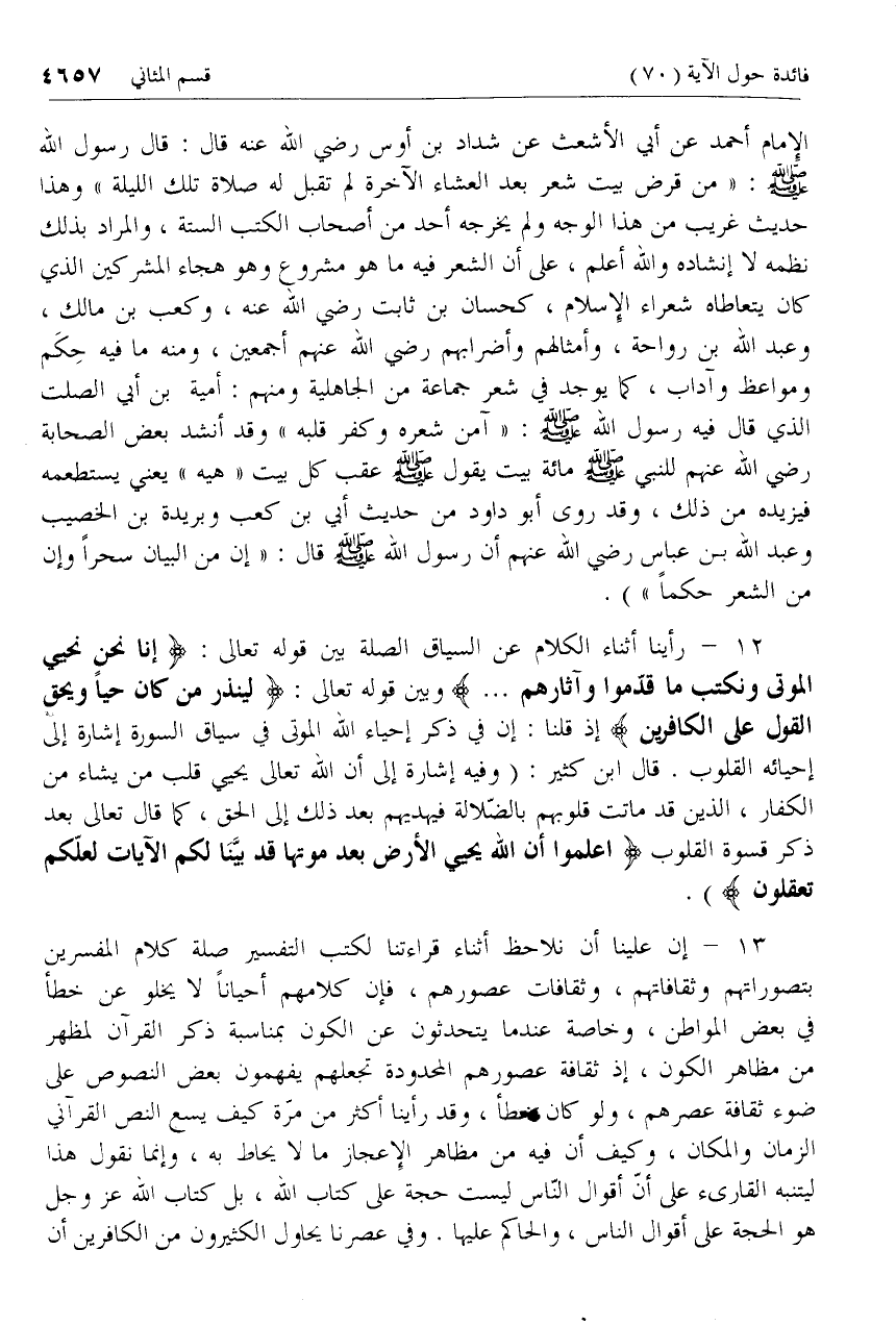 الإمام أحمد عن أبي الأشعث عن شداد بن أوس رضي الله عنه قال: قال رسول الله صلّى الله عليه وسلم: «من قرض بيت شعر بعد العشاء الآخرة لم تقبل له صلاة تلك الليلة» وهذا حديث غريب من هذا الوجه ولم يخرجه أحد من أصحاب الكتب الستة، والمراد بذلك نظمه لا إنشاده والله أعلم، على أن الشعر فيه ما هو مشروع وهو هجاء المشركين الذي كان يتعاطاه شعراء الإسلام، كحسان بن ثابت رضي الله عنه، وكعب بن مالك، وعبد الله بن رواحة، وأمثالهم وأضرابهم رضي الله عنهم أجمعين، ومنه ما فيه حكم ومواعظ وآداب، كما يوجد في شعر جماعة من الجاهلية ومنهم: أمية بن أبي الصلت الذي قال فيه رسول الله صلّى الله عليه وسلم: «آمن شعره وكفر قلبه» وقد أنشد بعض الصحابة رضي الله عنهم للنبي صلّى الله عليه وسلم مائة بيت يقول صلّى الله عليه وسلم عقب كل بيت «هيه» يعني يستطعمه فيزيده من ذلك، وقد روى أبو داود من حديث أبي بن كعب وبريدة بن الخصيب وعبد الله بن عباس رضي الله عنهم أن رسول الله صلّى الله عليه وسلم قال: «إن من البيان سحرا وإن من الشعر حكما»).