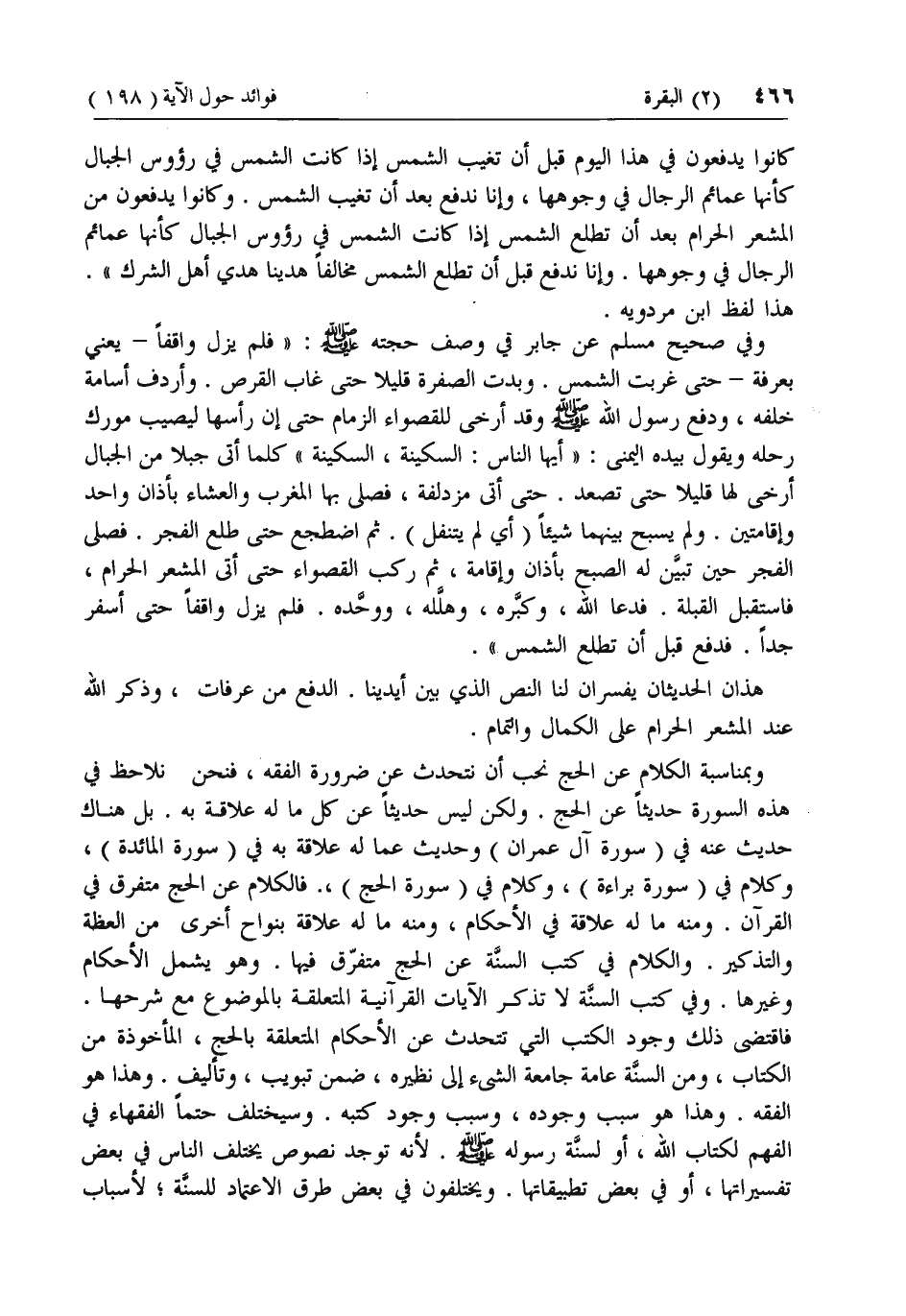 وبمناسبة الكلام عن الحج نحب أن نتحدث عن ضرورة الفقه، فنحن نلاحظ في هذه السورة حديثا عن الحج. ولكن ليس حديثا عن كل ما له علاقة به. بل هناك حديث عنه في (سورة آل عمران) وحديث عما له علاقة به في (سورة المائدة)، وكلام في (سورة براءة)، وكلام في (سورة الحج)،. فالكلام عن الحج متفرق في القرآن. ومنه ما له علاقة في الأحكام، ومنه ما له علاقة بنواح أخرى من العظة والتذكير. والكلام في كتب السنة عن الحج متفرق فيها. وهو يشمل الأحكام وغيرها. وفي كتب السنة لا تذكر الآيات القرآنية المتعلقة بالموضوع مع شرحها.