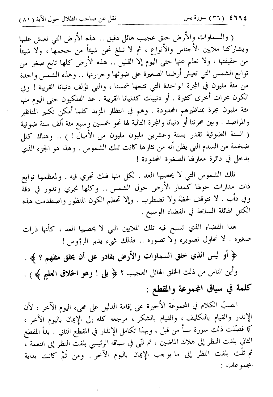 (والسماوات والأرض خلق عجيب هائل دقيق .. هذه الأرض التي نعيش عليها ويشاركنا ملايين الأجناس والأنواع، ثم لا نبلغ نحن شيئا من حجمها، ولا شيئا من حقيقتها، ولا نعلم عنها حتى اليوم إلا القليل .. هذه الأرض كلها تابع صغير من توابع الشمس التي تعيش أرضنا الصغيرة على ضوئها وحرارتها .. وهذه الشمس واحدة من مائة مليون في المجرة الواحدة التي تتبعها شمسنا، والتي تؤلف دنيانا القريبة! وفي الكون مجرات أخرى كثيرة. أو دنييات كدنيانا القريبة. عد الفلكيون حتى اليوم منها مائة مليون مجرة بمناظيرهم المحدودة. وهم في انتظار المزيد كلما أمكن تكبير المناظير والمراصد. وبين مجرتنا أو دنيانا والمجرة التالية لها نحو خمسين وسبع مائة ألف سنة ضوئية (السنة الضوئية تقدر بستة وعشرين مليون مليون من الأميال!) .. وهناك كتل ضخمة من السدم التي يظن أنه من نثارها كانت تلك الشموس. وهذا هو الجزء الذي يدخل في دائرة معارفنا الصغيرة المحدودة!