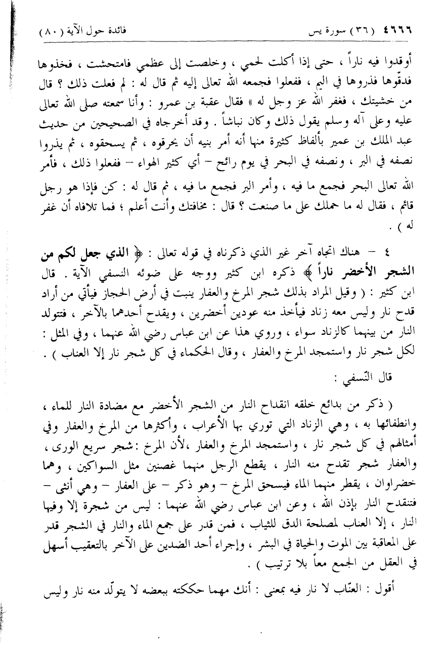 هناك اتجاه آخر غير الذي ذكرناه في قوله تعالى: الَّذِي جَعَلَ لَكُمْ مِنَ الشَّجَرِ الْأَخْضَرِ ناراً ذكره ابن كثير ووجه على ضوئه النسفي الآية. قال ابن كثير: (وقيل المراد بذلك شجر المرخ والعفار ينبت في أرض الحجاز فيأتي من أراد قدح نار وليس معه زناد فيأخذ منه عودين أخضرين، ويقدح أحدهما بالآخر، فتتولد النار من بينهما كالزناد سواء، وروي هذا عن ابن عباس رضي الله عنهما، وفي المثل: