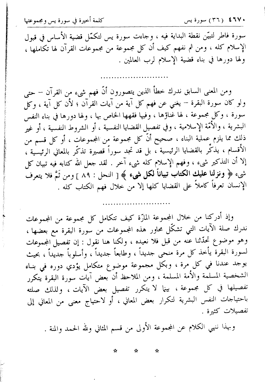 ومن المعنى السابق ندرك خطأ الذين يتصورون أنّ فهم شئ من القرآن- حتى ولو كان سورة البقرة- يغني عن فهم كل آية من آيات القرآن؛ لأن كل آية، وكل سورة، وكل مجموعة، لها غناؤها، وفيها فقهها الخاص بها، ولها دورها في بناء النفس البشرية، والأمّة الإسلامية، وفي تفصيل القضايا النفسية، أو الشروط النفسية، أو غير ذلك مما يلزم عملية البناء، صحيح أنّ كل مجموعة من المجموعات، أو كل قسم من الأقسام، يذكّر بالقضايا الرئيسية، بل قد تجد سورا قصيرة تذكّر بالمعاني الرئيسية، إلا أن التذكير شئ، وفهم الإسلام كله شئ آخر. لقد جعل الله كتابه فيه تبيان كل شئ وَنَزَّلْنا عَلَيْكَ الْكِتابَ تِبْياناً لِكُلِّ شَيْءٍ [النحل: 89] ومن ثمّ فلا يتعرف الإنسان تعرفا كاملا على القضايا كلها إلا من خلال فهم الكتاب كله.