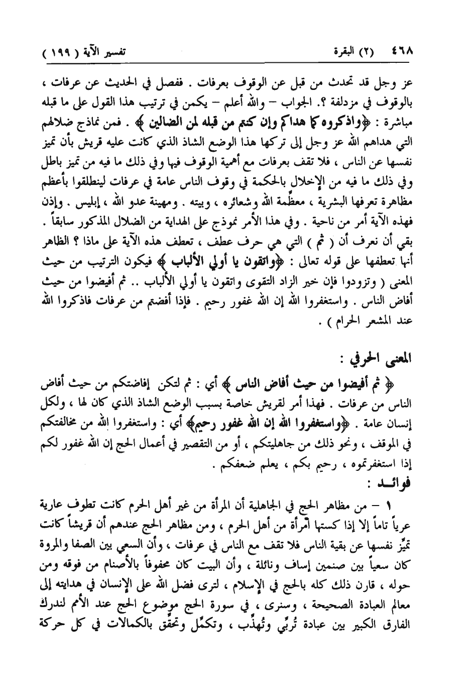 عزّ وجل قد تحدث من قبل عن الوقوف بعرفات. ففصل في الحديث عن عرفات، بالوقوف في مزدلفة؟. الجواب- والله أعلم- يكمن في ترتيب هذا القول على ما قبله مباشرة: وَاذْكُرُوهُ كَما هَداكُمْ وَإِنْ كُنْتُمْ مِنْ قَبْلِهِ لَمِنَ الضَّالِّينَ. فمن نماذج ضلالهم التي هداهم الله عزّ وجل إلى تركها هذا الوضع الشاذ الذي كانت عليه قريش بأن تميز نفسها عن الناس، فلا تقف بعرفات مع أهمية الوقوف فيها وفي ذلك ما فيه من تميز باطل وفي ذلك ما فيه من الإخلال بالحكمة في وقوف الناس عامة في عرفات لينطلقوا بأعظم مظاهرة تعرفها البشرية، معظمة الله وشعائره، وبيته. ومهينة عدو الله، إبليس. وإذن فهذه الآية أمر من ناحية. وفي هذا الأمر نموذج على الهداية من الضلال المذكور سابقا.