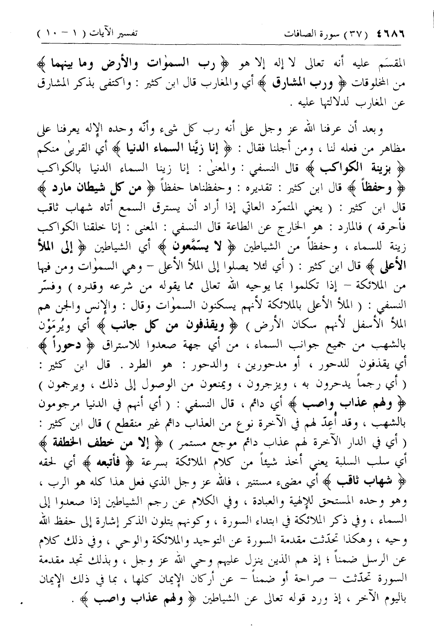 إِلَّا مَنْ خَطِفَ الْخَطْفَةَ أي سلب السلبة يعني أخذ شيئا من كلام الملائكة بسرعة فَأَتْبَعَهُ أي لحقه شِهابٌ ثاقِبٌ أي مضئ مستنير، فالله عزّ وجل الذي فعل هذا كله هو الرب، وهو وحده المستحق للإلهية والعبادة، وفي الكلام عن رجم الشياطين إذا صعدوا إلى السماء، وفي ذكر الملائكة في ابتداء السورة، وكونهم يتلون الذكر إشارة إلى حفظ الله وحيه، وهكذا تحدّثت مقدمة السورة عن التوحيد والملائكة والوحي، وفي ذلك كلام عن الرسل ضمنا؛ إذ هم الذين ينزل عليهم وحي الله عزّ وجل، وبذلك تجد مقدمة السورة تحدّثت- صراحة أو ضمنا- عن أركان الإيمان كلها، بما في ذلك الإيمان باليوم الآخر، إذ ورد قوله تعالى عن الشياطين وَلَهُمْ عَذابٌ واصِبٌ.