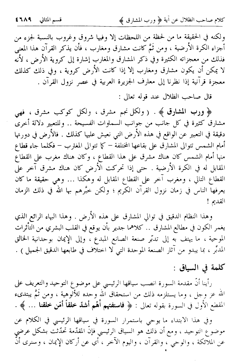 وهذا النظام الدقيق في توالي المشارق على هذه الأرض. وهذا البهاء الرائع الذي يغمر الكون في مطالع المشارق .. كلاهما جدير بأن يوقع في القلب البشري من التأثرات الموحية، ما يهتف به إلى تدبّر صنعة الصانع المبدع، وإلى الإيمان بوحدانية الخالق المدبّر، بما يبدو من آثار الصنعة الموحدة التي لا اختلاف في طابعها الدقيق الجميل).