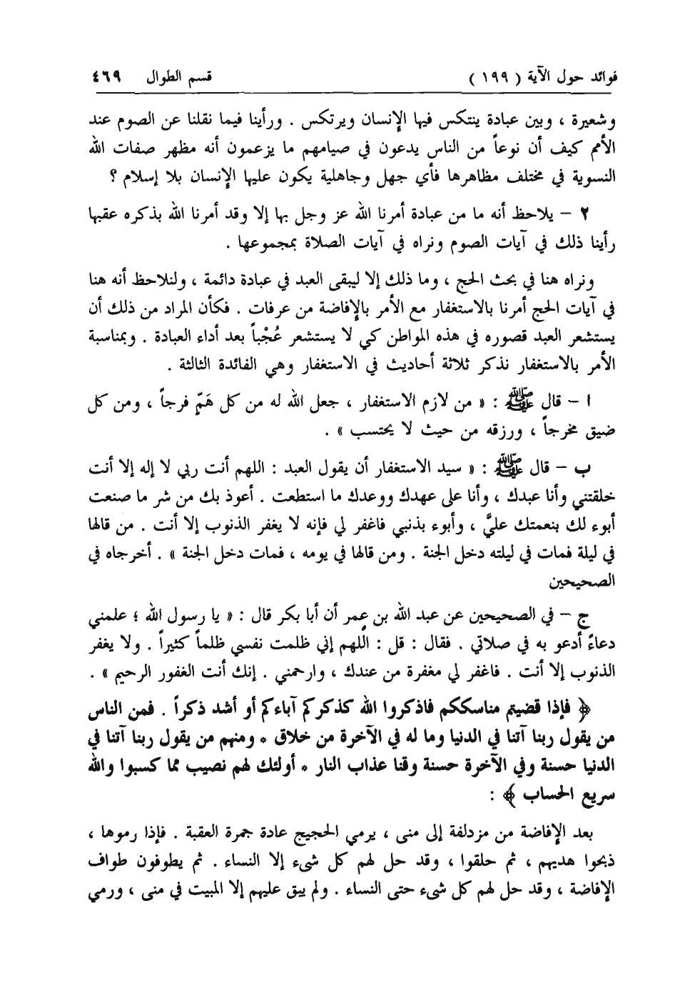 ونراه هنا في بحث الحج، وما ذلك إلا ليبقى العبد في عبادة دائمة، ولنلاحظ أنه هنا في آيات الحج أمرنا بالاستغفار مع الأمر بالإفاضة من عرفات. فكأن المراد من ذلك أن يستشعر العبد قصوره في هذه المواطن كيلا يستشعر عجبا بعد أداء العبادة. وبمناسبة الأمر بالاستغفار نذكر ثلاثة أحاديث في الاستغفار وهي الفائدة الثالثة.