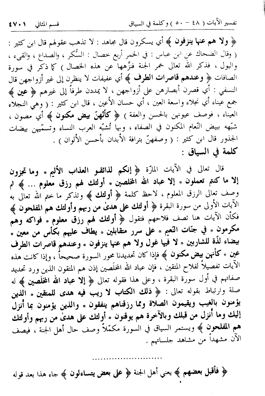 قال تعالى في الآيات المارّة إِنَّكُمْ لَذائِقُوا الْعَذابِ الْأَلِيمِ* وَما تُجْزَوْنَ إِلَّا ما كُنْتُمْ تَعْمَلُونَ* إِلَّا عِبادَ اللَّهِ الْمُخْلَصِينَ* أُولئِكَ لَهُمْ رِزْقٌ مَعْلُومٌ ... ثم وصف تعالى الرزق المعلوم، لاحظ كلمة أُولئِكَ وتذكر ما ختم الله تعالى به الآيات الأولى من سورة البقرة أُولئِكَ عَلى هُدىً مِنْ رَبِّهِمْ وَأُولئِكَ هُمُ الْمُفْلِحُونَ فكأن الآيات هنا تصف فلاحهم فتقول أُولئِكَ لَهُمْ رِزْقٌ مَعْلُومٌ* فَواكِهُ وَهُمْ مُكْرَمُونَ* فِي جَنَّاتِ النَّعِيمِ* عَلى سُرُرٍ مُتَقابِلِينَ* يُطافُ عَلَيْهِمْ بِكَأْسٍ مِنْ مَعِينٍ* بَيْضاءَ لَذَّةٍ لِلشَّارِبِينَ* لا فِيها غَوْلٌ وَلا هُمْ عَنْها يُنْزَفُونَ* وَعِنْدَهُمْ قاصِراتُ الطَّرْفِ عِينٌ* كَأَنَّهُنَّ بَيْضٌ مَكْنُونٌ فإذا كان تحديدنا محور السورة صحيحا، وإذا كانت هذه الآيات تفصيلا لفلاح المتقين، فإن عباد الله المخلصين إذن هم المتقون الذين ورد تحديد صفاتهم في أول سورة البقرة، وعلى هذا فقوله تعالى إِلَّا عِبادَ اللَّهِ الْمُخْلَصِينَ له صلة وارتباط بقوله تعالى: ذلِكَ الْكِتابُ لا رَيْبَ فِيهِ هُدىً لِلْمُتَّقِينَ* الَّذِينَ يُؤْمِنُونَ بِالْغَيْبِ وَيُقِيمُونَ الصَّلاةَ وَمِمَّا رَزَقْناهُمْ يُنْفِقُونَ* وَالَّذِينَ يُؤْمِنُونَ بِما أُنْزِلَ إِلَيْكَ وَما أُنْزِلَ مِنْ قَبْلِكَ وَبِالْآخِرَةِ هُمْ يُوقِنُونَ* أُولئِكَ عَلى هُدىً مِنْ رَبِّهِمْ وَأُولئِكَ هُمُ الْمُفْلِحُونَ ويستمر السياق في السورة مكمّلا وصف حال أهل الجنة، فيصف الآن مشهدا من مشاهد جلساتهم.