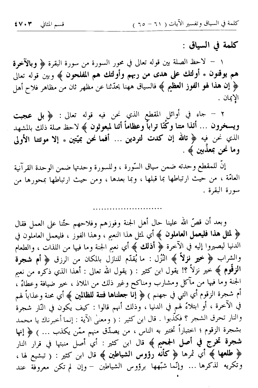 2 - جاء في أوائل المقطع الذي نحن فيه قوله تعالى: بَلْ عَجِبْتَ وَيَسْخَرُونَ ... أَإِذا مِتْنا وَكُنَّا تُراباً وَعِظاماً أَإِنَّا لَمَبْعُوثُونَ لاحظ صلة ذلك بالمشهد الذي نحن فيه تَاللَّهِ إِنْ كِدْتَ لَتُرْدِينِ ... أَفَما نَحْنُ بِمَيِّتِينَ* إِلَّا مَوْتَتَنَا الْأُولى وَما نَحْنُ بِمُعَذَّبِينَ.