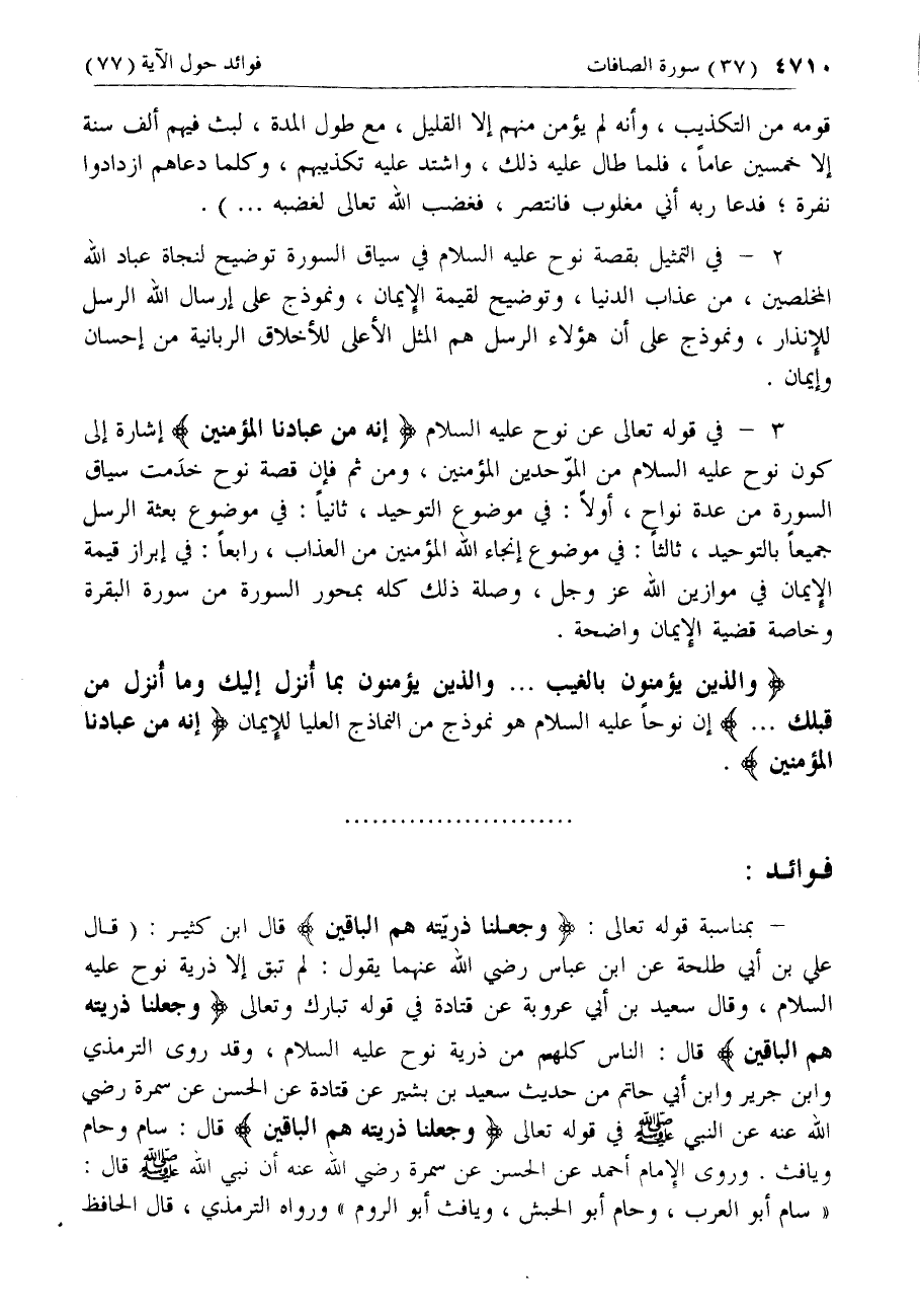 - بمناسبة قوله تعالى: وَجَعَلْنا ذُرِّيَّتَهُ هُمُ الْباقِينَ قال ابن كثير: (قال علي بن أبي طلحة عن ابن عباس رضي الله عنهما يقول: لم تبق إلا ذرية نوح عليه السلام، وقال سعيد بن أبي عروبة عن قتادة في قوله تبارك وتعالى وَجَعَلْنا ذُرِّيَّتَهُ هُمُ الْباقِينَ قال: الناس كلهم من ذرية نوح عليه السلام، وقد روى الترمذي وابن جرير وابن أبي حاتم من حديث سعيد بن بشير عن قتادة عن الحسن عن سمرة رضي الله عنه عن النبي صلّى الله عليه وسلم في قوله تعالى وَجَعَلْنا ذُرِّيَّتَهُ هُمُ الْباقِينَ قال: سام وحام ويافث. وروى الإمام أحمد عن الحسن عن سمرة رضي الله عنه أن نبي الله صلّى الله عليه وسلم قال: