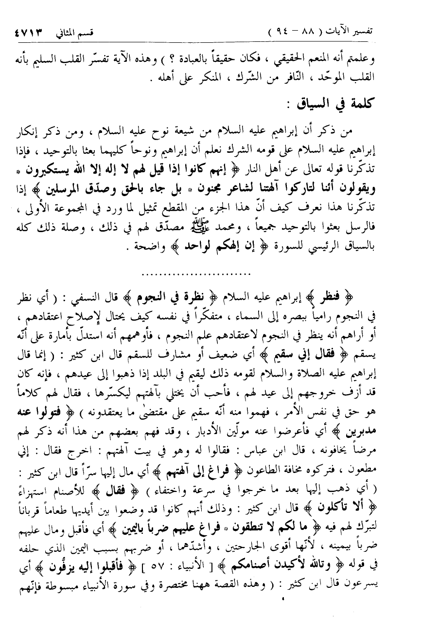 فَقالَ إِنِّي سَقِيمٌ أي ضعيف أو مشارف للسقم قال ابن كثير: (إنما قال إبراهيم عليه الصلاة والسلام لقومه ذلك ليقيم في البلد إذا ذهبوا إلى عيدهم، فإنه كان قد أزف خروجهم إلى عيد لهم، فأحب أن يختلي بآلهتهم ليكسّرها، فقال لهم كلاما هو حق في نفس الأمر، فهموا منه أنّه سقيم على مقتضى ما يعتقدونه)