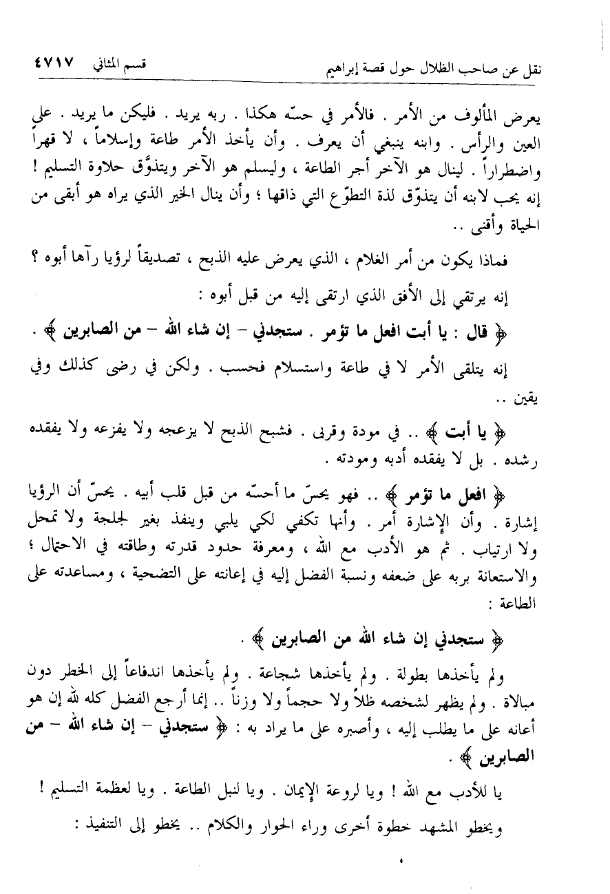 يعرض المألوف من الأمر. فالأمر في حسّه هكذا. ربه يريد. فليكن ما يريد. على العين والرأس. وابنه ينبغي أن يعرف. وأن يأخذ الأمر طاعة وإسلاما، لا قهرا واضطرارا. لينال هو الآخر أجر الطاعة، وليسلم هو الآخر ويتذوّق حلاوة التسليم! إنه يحب لابنه أن يتذوّق لذة التطوّع التي ذاقها؛ وأن ينال الخير الذي يراه هو أبقى من الحياة وأقنى ..
