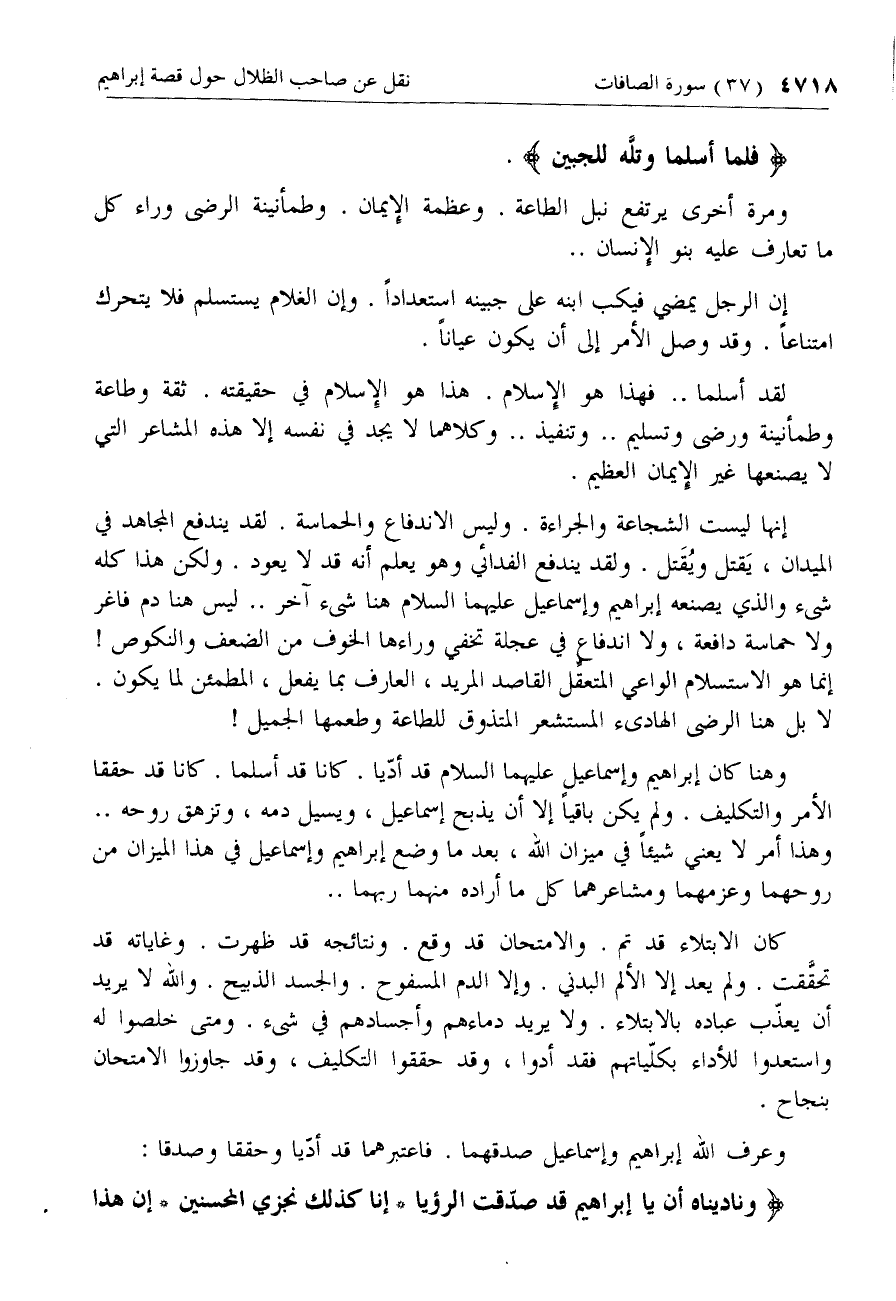 إنها ليست الشجاعة والجراءة. وليس الاندفاع والحماسة. لقد يندفع المجاهد في الميدان، يقتل ويقتل. ولقد يندفع الفدائي وهو يعلم أنه قد لا يعود. ولكن هذا كله شئ والذي يصنعه إبراهيم وإسماعيل عليهما السلام هنا شئ آخر .. ليس هنا دم فاغر ولا حماسة دافعة، ولا اندفاع في عجلة تخفي وراءها الخوف من الضعف والنكوص! إنما هو الاستسلام الواعي المتعقّل القاصد المريد، العارف بما يفعل، المطمئن لما يكون.