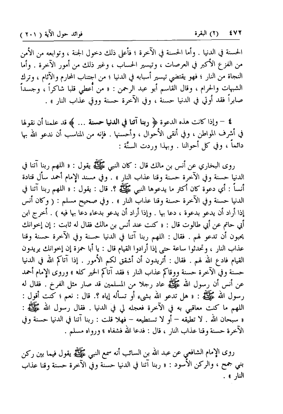 روى البخاري عن أنس بن مالك قال: كان النبي صلى الله عليه وسلم يقول: «اللهم ربنا آتنا في الدنيا حسنة وفي الآخرة حسنة وقنا عذاب النار». وفي مسند الإمام أحمد سأل قتادة أنسا: أي دعوة كان أكثر ما يدعوها النبي صلى الله عليه وسلم؟. قال: يقول: «اللهم ربنا آتنا في الدنيا حسنة وفي الآخرة حسنة وقنا عذاب النار». وفي صحيح مسلم: (وكان أنس إذا أراد أن يدعو بدعوة، دعا بها. وإذا أراد أن يدعو بدعاء دعا بها فيه). أخرج ابن أبي حاتم عن أبي طالوت قال: «كنت عند أنس بن مالك فقال له ثابت: إن إخوانك يحبون أن تدعو لهم. فقال: اللهم ربنا آتنا في الدنيا حسنة وفي الآخرة حسنة وقنا عذاب النار، وتحدثوا ساعة حتى إذا أرادوا القيام قال: يا أبا حمزة إن إخوانك يريدون القيام فادع الله لهم. فقال: أتريدون أن أشقق لكم الأمور. إذا آتاكم الله في الدنيا حسنة وفي الآخرة حسنة ووقاكم عذاب النار؛ فقد آتاكم الخير كله» وروى الإمام أحمد عن أنس أن رسول الله صلى الله عليه وسلم عاد رجلا من المسلمين قد صار مثل الفرخ. فقال له رسول الله صلى الله عليه وسلم: «هل تدعو الله بشيء أو تسأله إياه؟. قال: نعم؛ كنت أقول: