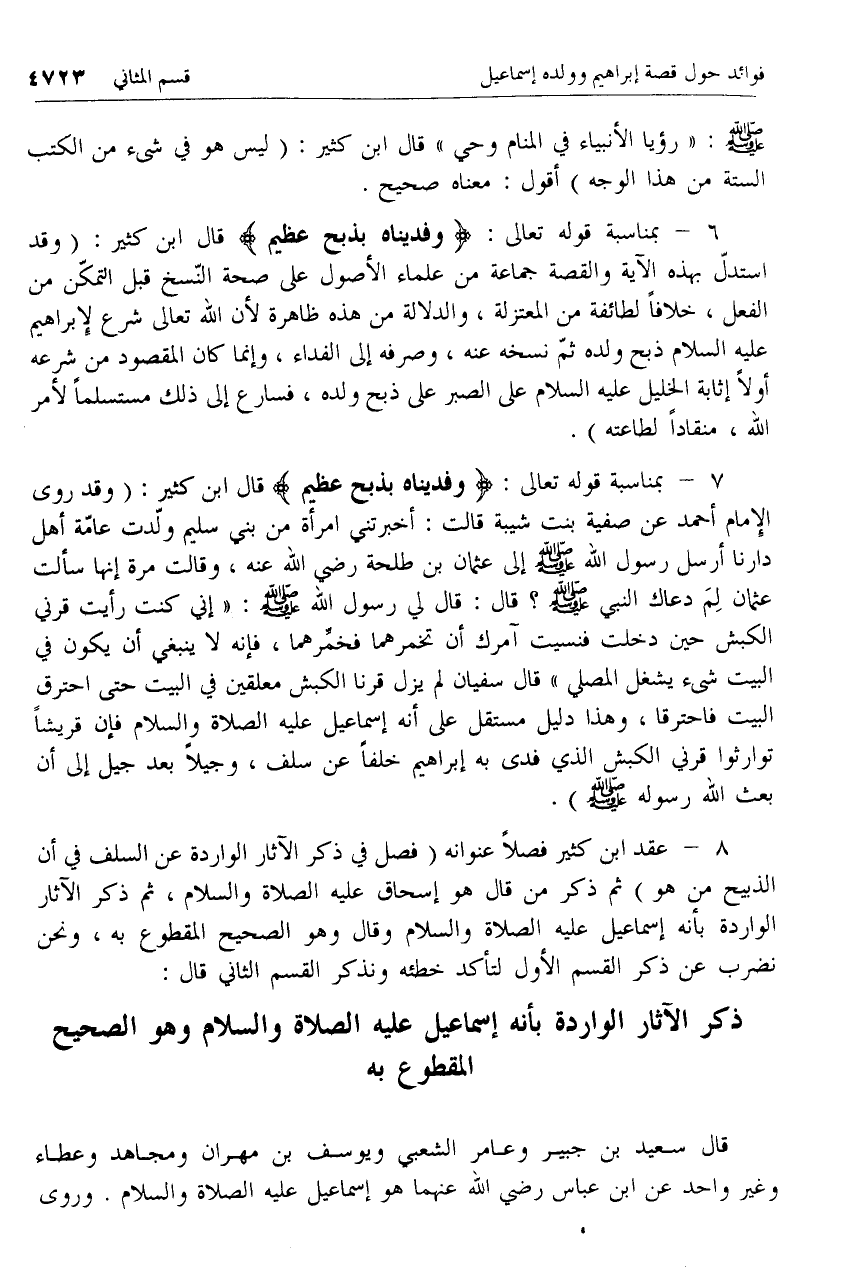 عقد ابن كثير فصلا عنوانه (فصل في ذكر الآثار الواردة عن السلف في أن الذبيح من هو) ثم ذكر من قال هو إسحاق عليه الصلاة والسلام، ثم ذكر الآثار الواردة بأنه إسماعيل عليه الصلاة والسلام وقال وهو الصحيح المقطوع به، ونحن نضرب عن ذكر القسم الأول لتأكد خطئه ونذكر القسم الثاني قال: