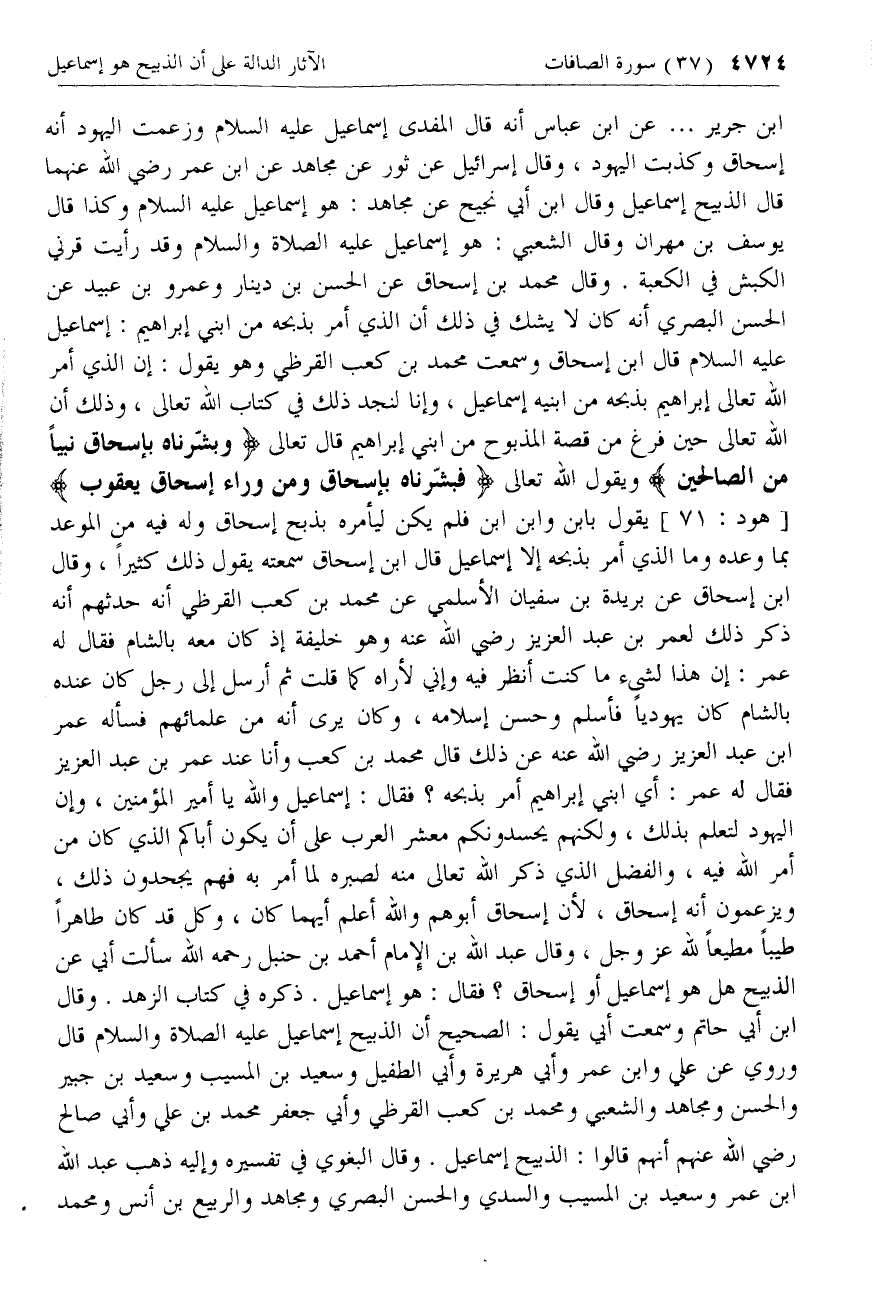 ابن جرير ... عن ابن عباس أنه قال المفدى إسماعيل عليه السلام وزعمت اليهود أنه إسحاق وكذبت اليهود، وقال إسرائيل عن ثور عن مجاهد عن ابن عمر رضي الله عنهما قال الذبيح إسماعيل وقال ابن أبي نجيح عن مجاهد: هو إسماعيل عليه السلام وكذا قال يوسف بن مهران وقال الشعبي: هو إسماعيل عليه الصلاة والسلام وقد رأيت قرني الكبش في الكعبة. وقال محمد بن إسحاق عن الحسن بن دينار وعمرو بن عبيد عن الحسن البصري أنه كان لا يشك في ذلك أن الذي أمر بذبحه من ابني إبراهيم: إسماعيل عليه السلام قال ابن إسحاق وسمعت محمد بن كعب القرظي وهو يقول: إن الذي أمر الله تعالى إبراهيم بذبحه من ابنيه إسماعيل، وإنا لنجد ذلك في كتاب الله تعالى، وذلك أن الله تعالى حين فرغ من قصة المذبوح من ابني إبراهيم قال تعالى وَبَشَّرْناهُ بِإِسْحاقَ نَبِيًّا مِنَ الصَّالِحِينَ ويقول الله تعالى فَبَشَّرْناها بِإِسْحاقَ وَمِنْ وَراءِ إِسْحاقَ يَعْقُوبَ [هود: 71] يقول بابن وابن ابن فلم يكن ليأمره بذبح إسحاق وله فيه من الموعد بما وعده وما الذي أمر بذبحه إلا إسماعيل قال ابن إسحاق سمعته يقول ذلك كثيرا، وقال ابن إسحاق عن بريدة بن سفيان الأسلمي عن محمد بن كعب القرظي أنه حدثهم أنه ذكر ذلك لعمر بن عبد العزيز رضي الله عنه وهو خليفة إذ كان معه بالشام فقال له عمر: إن هذا لشيء ما كنت انظر فيه وإني لأراه كما قلت ثم أرسل إلى رجل كان عنده بالشام كان يهوديا فأسلم وحسن إسلامه، وكان يرى أنه من علمائهم فسأله عمر ابن عبد العزيز رضي الله عنه عن ذلك قال محمد بن كعب وأنا عند عمر بن عبد العزيز فقال له عمر: أي ابني إبراهيم أمر بذبحه؟ فقال: إسماعيل والله يا أمير المؤمنين، وإن اليهود لتعلم بذلك، ولكنهم يحسدونكم معشر العرب على أن يكون أباكم الذي كان من أمر الله فيه، والفضل الذي ذكر الله تعالى منه لصبره لما أمر به فهم يجحدون ذلك، ويزعمون أنه إسحاق، لأن إسحاق أبوهم والله أعلم أيهما كان، وكل قد كان طاهرا طيبا مطيعا لله عزّ وجل، وقال عبد الله