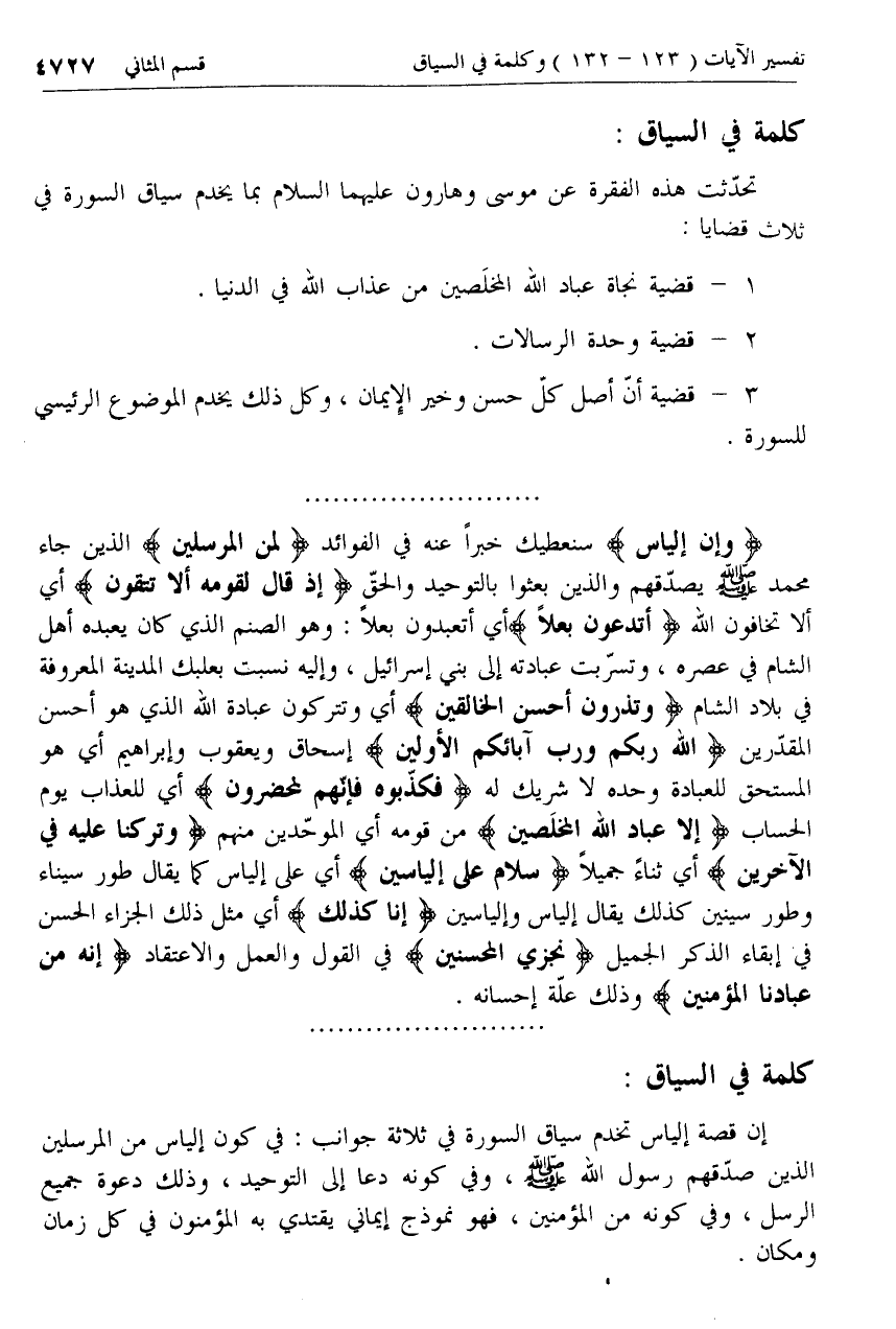 إن قصة إلياس تخدم سياق السورة في ثلاثة جوانب: في كون إلياس من المرسلين الذين صدّقهم رسول الله صلّى الله عليه وسلم، وفي كونه دعا إلى التوحيد، وذلك دعوة جميع الرسل، وفي كونه من المؤمنين، فهو نموذج إيماني يقتدي به المؤمنون في كل زمان ومكان.