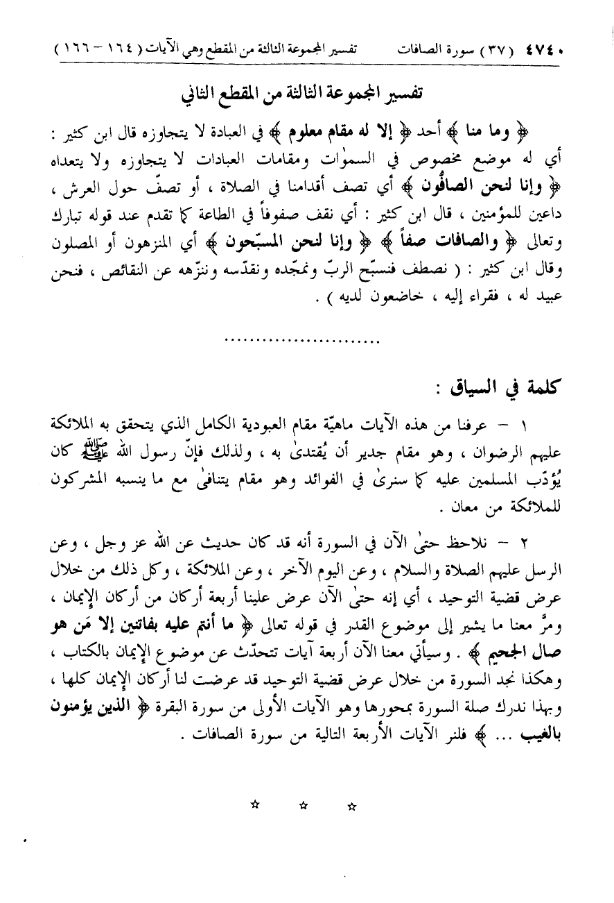 2 - نلاحظ حتى الآن في السورة أنه قد كان حديث عن الله عزّ وجل، وعن الرسل عليهم الصلاة والسلام، وعن اليوم الآخر، وعن الملائكة، وكل ذلك من خلال عرض قضية التوحيد، أي إنه حتى الآن عرض علينا أربعة أركان من أركان الإيمان، ومرّ معنا ما يشير إلى موضوع القدر في قوله تعالى ما أَنْتُمْ عَلَيْهِ بِفاتِنِينَ إِلَّا مَنْ هُوَ صالِ الْجَحِيمِ. وسيأتي معنا الآن أربعة آيات تتحدّث عن موضوع الإيمان بالكتاب، وهكذا نجد السورة من خلال عرض قضية التوحيد قد عرضت لنا أركان الإيمان كلها، وبهذا ندرك صلة السورة بمحورها وهو الآيات الأولى من سورة البقرة الَّذِينَ يُؤْمِنُونَ بِالْغَيْبِ ... فلنر الآيات الأربعة التالية من سورة الصافات.