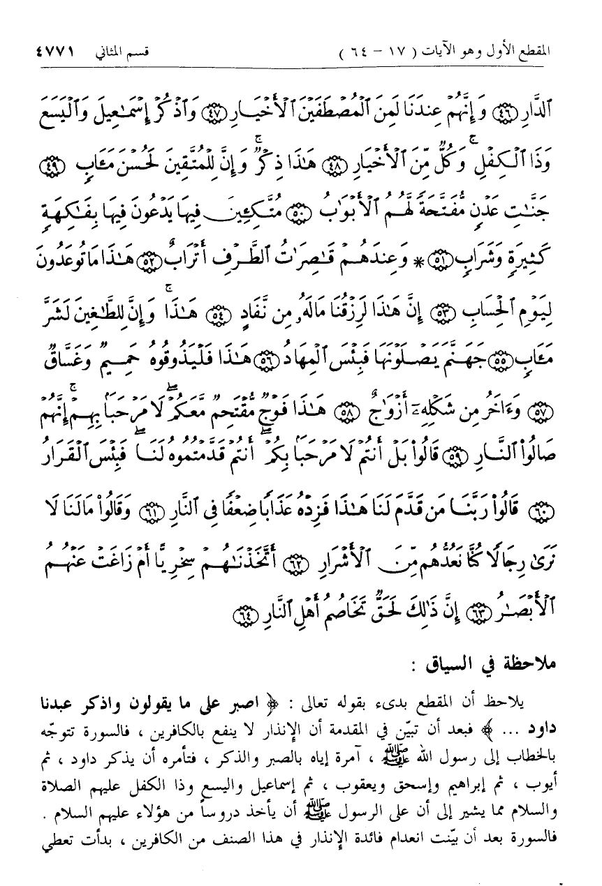 يلاحظ أن المقطع بدئ بقوله تعالى: اصْبِرْ عَلى ما يَقُولُونَ وَاذْكُرْ عَبْدَنا داوُدَ ... فبعد أن تبيّن في المقدمة أن الإنذار لا ينفع بالكافرين، فالسورة تتوجّه بالخطاب إلى رسول الله صلّى الله عليه وسلم، آمرة إياه بالصبر والذكر، فتأمره أن يذكر داود، ثم أيوب، ثم إبراهيم وإسحاق ويعقوب، ثم إسماعيل واليسع وذا الكفل عليهم الصلاة والسلام مما يشير إلى أن على الرسول صلّى الله عليه وسلم أن يأخذ دروسا من هؤلاء عليهم السلام.