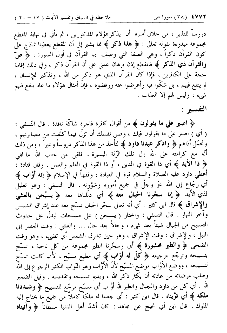 (أي) اصبر على ما يقولون فيك، وصن نفسك أن تزلّ فيما كلّفت من مصابرتهم، وتحمّل أذاهم وَاذْكُرْ عَبْدَنا داوُدَ لتأخذ من هذا الذكر دروسا وعبرا، ومن ذلك أنّه مع كرامته على الله زل تلك الزّلة اليسيرة، فلقي من عتاب الله ما لقي ذَا الْأَيْدِ أي ذا القوة في الدين، أو ذا القوة في العلم والعمل. وقال قتادة: