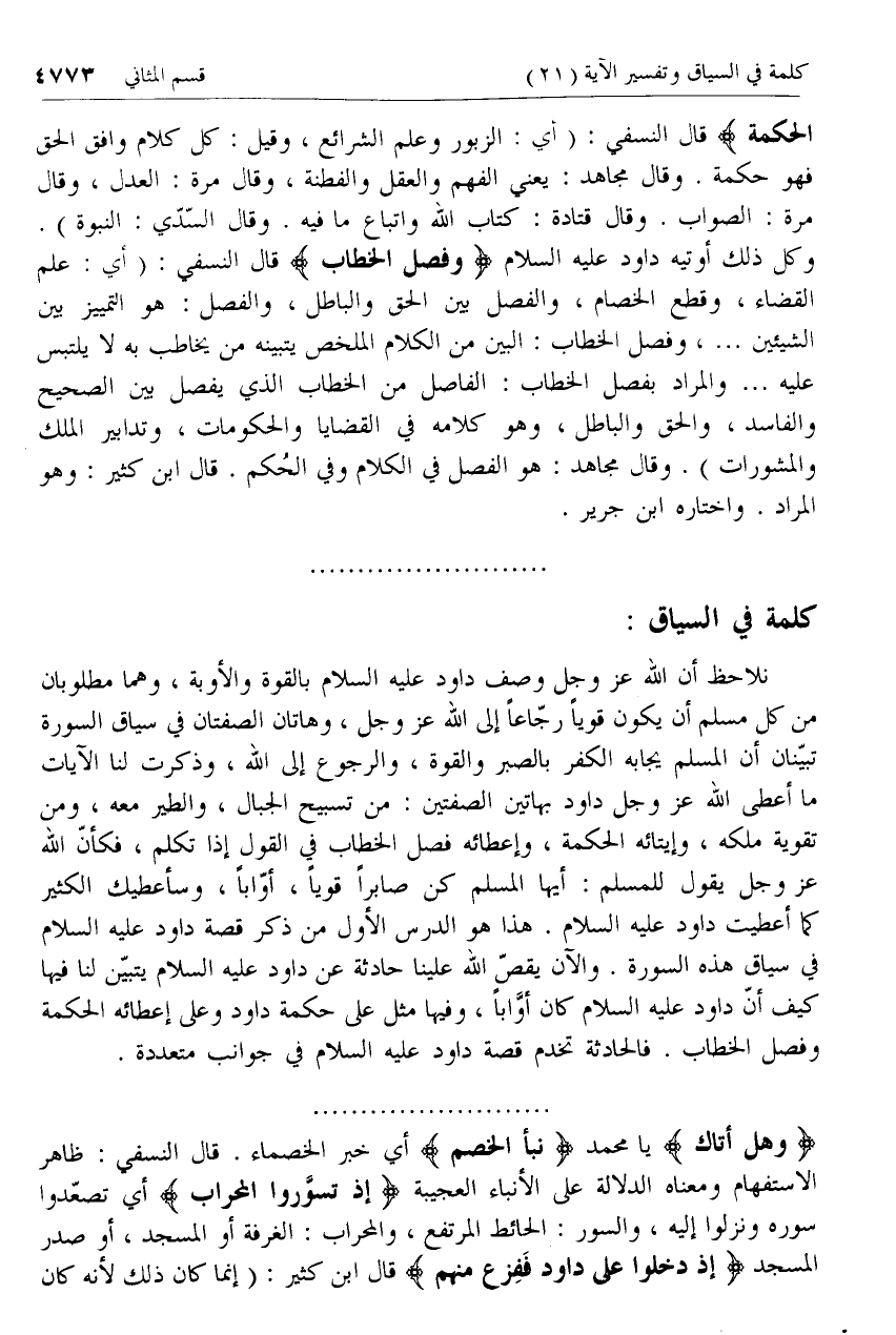 وكل ذلك أوتيه داود عليه السّلام وَفَصْلَ الْخِطابِ قال النسفي: (أي: علم القضاء، وقطع الخصام، والفصل بين الحق والباطل، والفصل: هو التمييز بين الشيئين ... ، وفصل