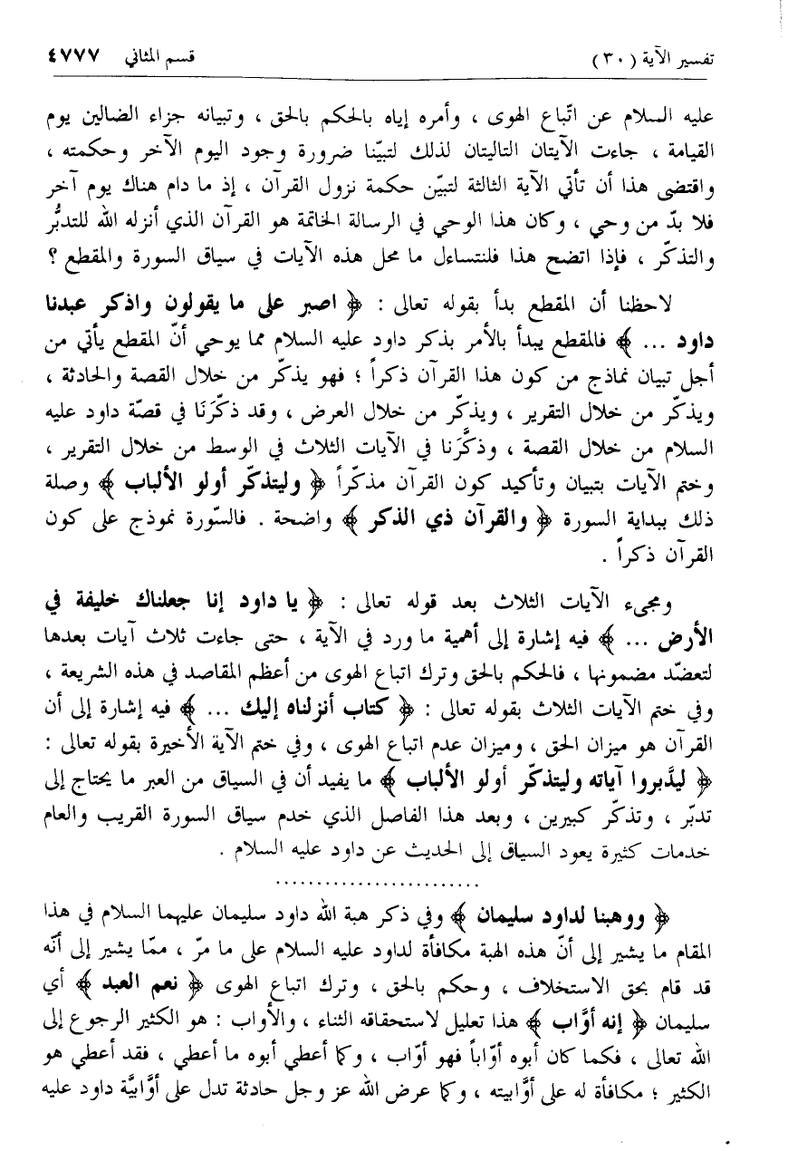 لِيَدَّبَّرُوا آياتِهِ وَلِيَتَذَكَّرَ أُولُوا الْأَلْبابِ ما يفيد أن في السياق من العبر ما يحتاج إلى تدبّر، وتذكّر كبيرين، وبعد هذا الفاصل الذي خدم سياق السورة القريب والعام خدمات كثيرة يعود السياق إلى الحديث عن داود عليه السلام.