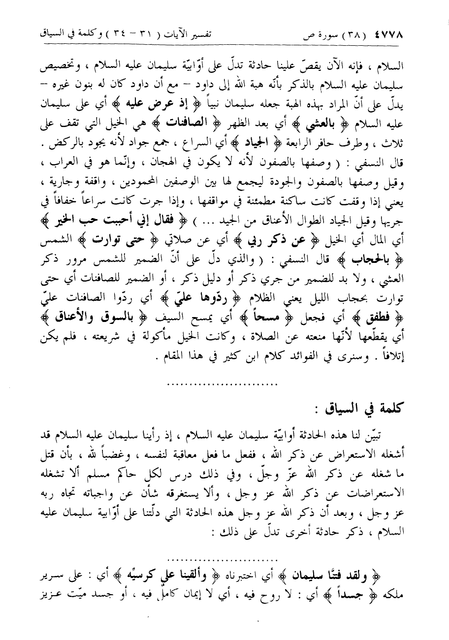 فَقالَ إِنِّي أَحْبَبْتُ حُبَّ الْخَيْرِ أي المال أي الخيل عَنْ ذِكْرِ رَبِّي أي عن صلاتي حَتَّى تَوارَتْ الشمس بِالْحِجابِ قال النسفي: (والذي دلّ على أنّ الضمير للشمس مرور ذكر العشي، ولا بد للضمير من جري ذكر أو دليل ذكر، أو الضمير للصافنات أي حتى توارت بحجاب الليل يعني الظلام