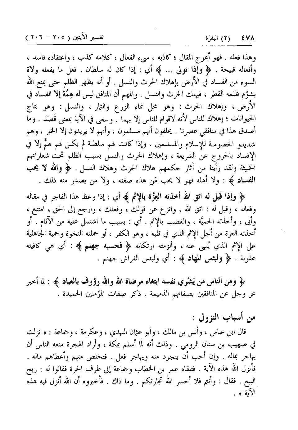 وهذا فعله. فهو أعوج المقال؛ كاذبه، سيئ الفعال، كلامه كذب، واعتقاده فاسد، وأفعاله قبيحة. وَإِذا تَوَلَّى ... أي: إذا كان له سلطان. فعل ما يفعله ولاة السوء من الفساد في الأرض بإهلاك الحرث والنسل. أو أنه يظهر الظلم حتى يمنع الله بشؤم ظلمه القطر، فيهلك الحرث والنسل. والمهم أن المنافق ليس له همة إلا الفساد في الأرض، وإهلاك الحرث: وهو محل نماء الزرع والثمار، والنسل: وهو نتاج الحيوانات؛ إهلاك للناس لأنه لاقوام للناس إلا بهما. وسعى في الآية بمعنى قصد. وما أصدق هذا في