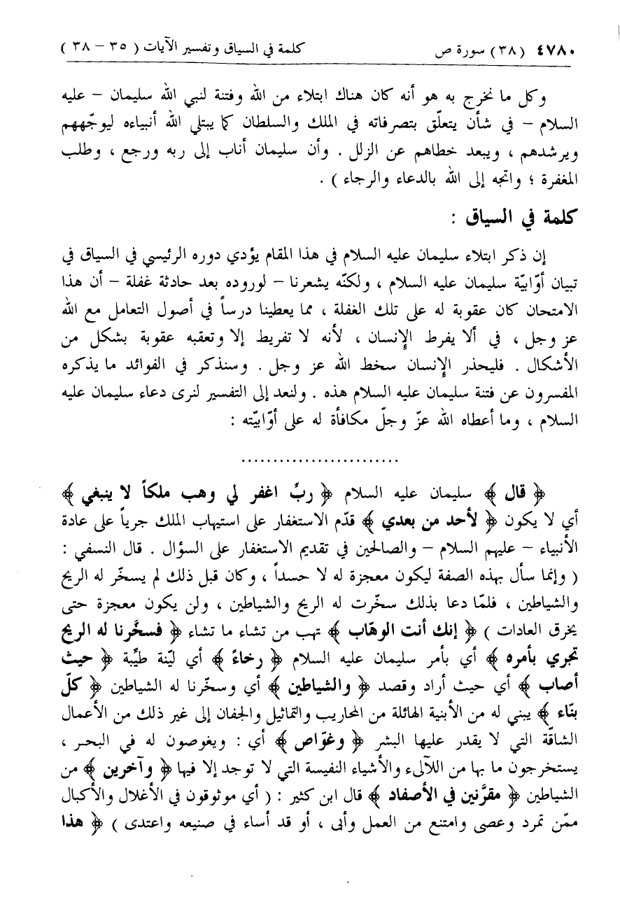 وكل ما نخرج به هو أنه كان هناك ابتلاء من الله وفتنة لنبي الله سليمان- عليه السلام- في شأن يتعلّق بتصرفاته في الملك والسلطان كما يبتلي الله أنبياءه ليوجّههم ويرشدهم، ويبعد خطاهم عن الزلل. وأن سليمان أناب إلى ربه ورجع، وطلب المغفرة؛ واتجه إلى الله بالدعاء والرجاء).
