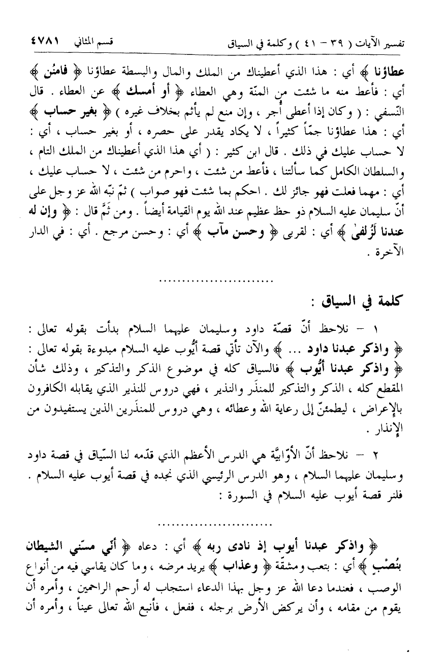 وَاذْكُرْ عَبْدَنا أَيُّوبَ فالسياق كله في موضوع الذكر والتذكير، وذلك شأن المقطع كله، الذكر والتذكير للمنذر والنذير، فهي دروس للنذير الذي يقابله الكافرون بالإعراض، ليطمئنّ إلى رعاية الله وعطائه، وهي دروس للمنذرين الذين يستفيدون من الإنذار.