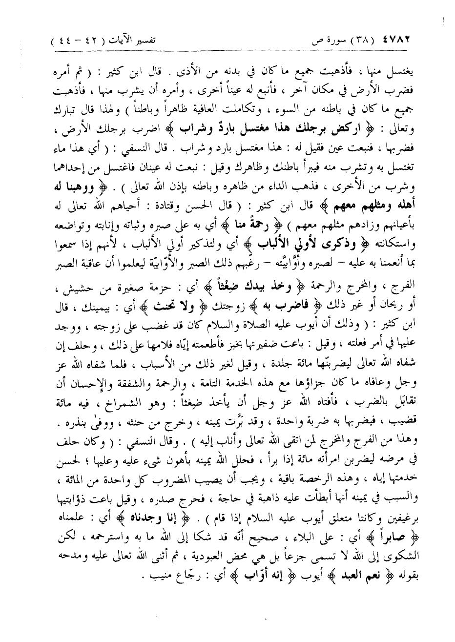 وهذا من الفرج والمخرج لمن اتقى الله تعالى وأناب إليه). وقال النسفي: (وكان حلف في مرضه ليضربن امرأته مائة إذا برأ، فحلل الله يمينه بأهون شئ عليه وعليها؛ لحسن خدمتها إياه، وهذه الرخصة باقية، ويجب أن يصيب المضروب كل واحدة من المائة، والسبب في يمينه أنها أبطأت عليه ذاهبة في حاجة، فحرج صدره، وقيل باعت ذؤابتيها برغيفين وكانتا متعلق أيوب عليه السلام إذا قام). إِنَّا وَجَدْناهُ أي: علمناه صابِراً أي: على البلاء، صحيح أنّه قد شكا إلى الله ما به واسترحمه، لكن الشكوى إلى الله لا تسمى جزعا بل هي محض العبودية، ثم أثنى الله تعالى عليه ومدحه بقوله نِعْمَ الْعَبْدُ أيوب إِنَّهُ أَوَّابٌ أي: رجّاع منيب.