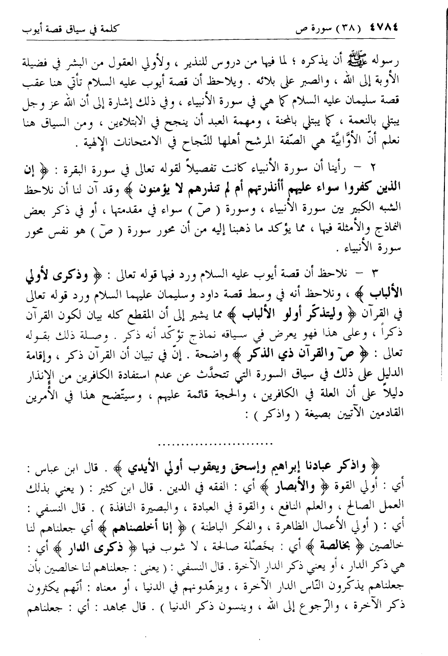 3 - نلاحظ أن قصة أيوب عليه السلام ورد فيها قوله تعالى: وَذِكْرى لِأُولِي الْأَلْبابِ، ونلاحظ أنه في وسط قصة داود وسليمان عليهما السلام ورد قوله تعالى في القرآن وَلِيَتَذَكَّرَ أُولُوا الْأَلْبابِ مما يشير إلى أن المقطع كله بيان لكون القرآن ذكرا، وعلى هذا فهو يعرض في سياقه نماذج تؤكّد أنه ذكر. وصلة ذلك بقوله تعالى: ص وَالْقُرْآنِ ذِي الذِّكْرِ واضحة. إنّ في تبيان أن القرآن ذكر، وإقامة الدليل على ذلك في سياق السورة التي تتحدّث عن عدم استفادة الكافرين من الإنذار دليلا على أن العلة في الكافرين، والحجة قائمة عليهم، وسيتّضح هذا في الأمرين القادمين الآتيين بصيغة (واذكر):