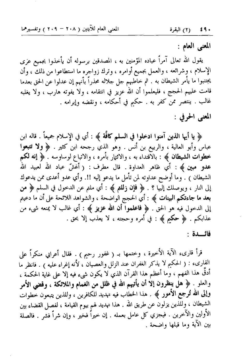 قرأ قارئ الآية الأخيرة، وختمها ب غَفُورٌ رَحِيمٌ. فقال أعرابي منكرا على القارئ: (الحكيم لا يذكر الغفران عند الزلل والعصيان، لأنه إغراء عليه). فانظر ما أدق هذا الفهم، وما أعظم هذا القرآن الذي لا يكون شئ فيه إلا على غاية الحكمة، والعلو. هَلْ يَنْظُرُونَ إِلَّا أَنْ يَأْتِيَهُمُ اللَّهُ فِي ظُلَلٍ مِنَ الْغَمامِ وَالْمَلائِكَةُ، وَقُضِيَ الْأَمْرُ وَإِلَى اللَّهِ تُرْجَعُ الْأُمُورُ. هذا الخطاب فيه تهديد للكافرين، وللذين يتبعون خطوات الشيطان، وللذين يزلون عن طريق الله. هذا تهديد لهم بيوم القيامة، لفصل القضاء بين الأولين والآخرين. فيجزي كل عامل بعمله. إن خيرا فخير، وإن شرا فشر. فالصلة بين الآية وما قبلها واضحة.