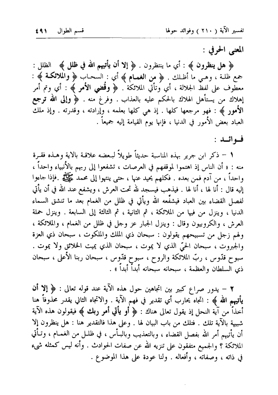 2 - يدور صراع كبير بين اتجاهين حول هذه الآية عند قوله تعالى: إِلَّا أَنْ يَأْتِيَهُمُ اللَّهُ: اتجاه يحارب أي تقدير في فهم الآية. والاتجاه الثاني يقدر محذوفا هنا أخذا من آية النحل إذ يقول تعالى هناك: أَوْ يَأْتِيَ أَمْرُ رَبِّكَ فيقولون هذه الآية شبيهة بالآية تلك. فتلك من باب البيان لها. وعلى هذا فالتقدير هنا: هل ينظرون إلا أن يأتيهم أمر الله بفصل القضاء، وبالتعذيب وبالبأس، في ظلل من الغمام، وتأتي الملائكة؟ والجميع متفقون على تنزيه الله عن صفات الحوادث. وأنه ليس كمثله شئ في ذاته، وصفاته، وأفعاله. ولنا عودة على هذا الموضوع.