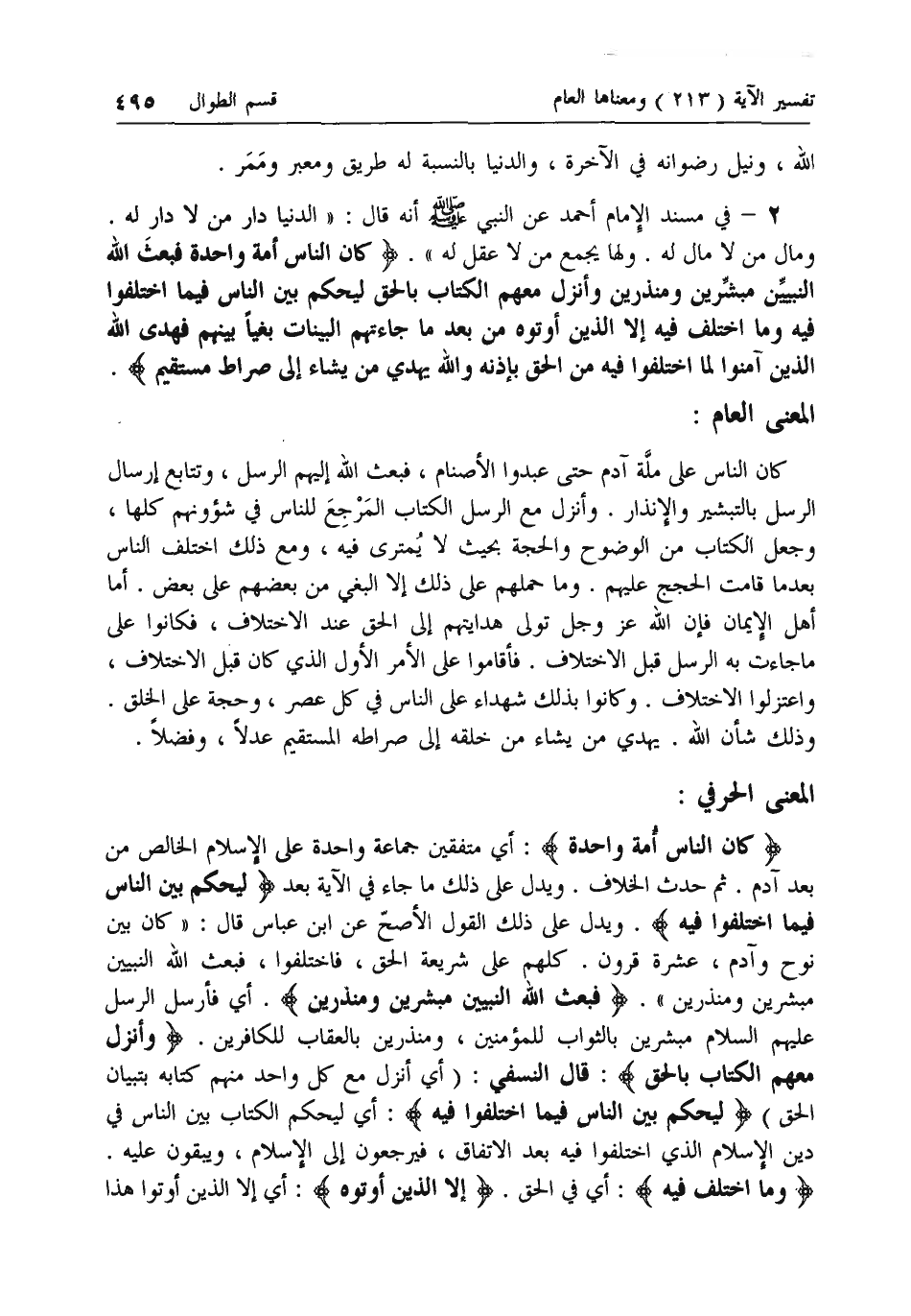 كانَ النَّاسُ أُمَّةً واحِدَةً: أي متفقين جماعة واحدة على الإسلام الخالص من بعد آدم. ثم حدث الخلاف. ويدل على ذلك ما جاء في الآية بعد لِيَحْكُمَ بَيْنَ النَّاسِ فِيمَا اخْتَلَفُوا فِيهِ. ويدل على ذلك القول الأصح عن ابن عباس قال: «كان بين نوح وآدم، عشرة قرون. كلهم على شريعة الحق، فاختلفوا، فبعث الله النبيين مبشرين ومنذرين». فَبَعَثَ اللَّهُ النَّبِيِّينَ مُبَشِّرِينَ وَمُنْذِرِينَ. أي فأرسل الرسل عليهم السلام مبشرين بالثواب للمؤمنين، ومنذرين بالعقاب للكافرين. وَأَنْزَلَ مَعَهُمُ الْكِتابَ بِالْحَقِّ: قال النسفي: (أي أنزل مع كل واحد منهم كتابه بتبيان الحق) لِيَحْكُمَ بَيْنَ النَّاسِ فِيمَا اخْتَلَفُوا فِيهِ: أي ليحكم الكتاب بين الناس في دين الإسلام الذي اختلفوا فيه بعد الاتفاق، فيرجعون إلى الإسلام، ويبقون عليه.