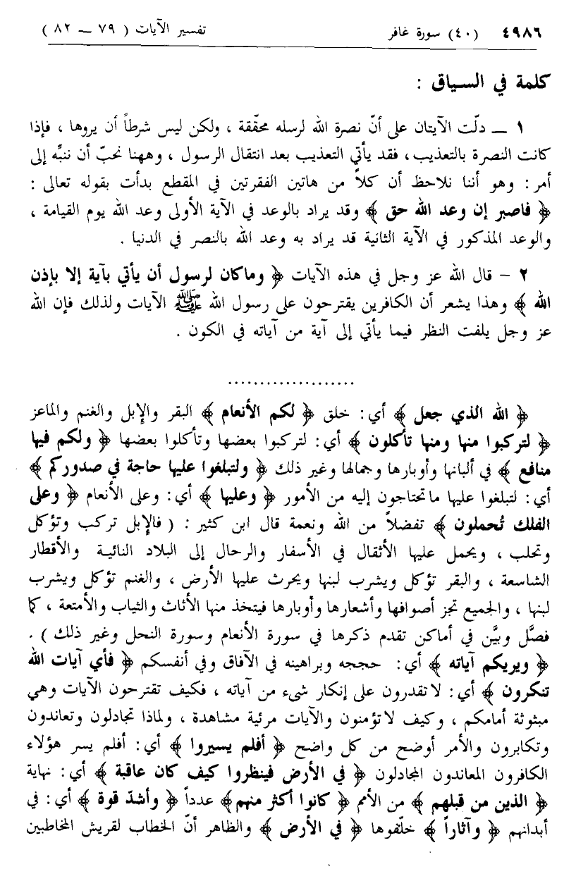 وَلَكُمْ فِيها مَنافِعُ في ألبانها وأوبارها وجمالها وغير ذلك وَلِتَبْلُغُوا عَلَيْها حاجَةً فِي صُدُورِكُمْ أي: لتبلغوا عليها ما تحتاجون إليه من الأمور وَعَلَيْها أي: وعلى الأنعام وَعَلَى الْفُلْكِ تُحْمَلُونَ تفضلا من الله ونعمة قال ابن كثير: (فالإبل تركب وتؤكل وتحلب، ويحمل عليها الأثقال في الأسفار والرحال إلى البلاد النائية والأقطار الشاسعة، والبقر تؤكل ويشرب لبنها ويحرث عليها الأرض، والغنم تؤكل ويشرب لبنها، والجميع تجز أصوافها وأشعارها وأوبارها فيتخذ منها الأثاث والثياب والأمتعة، كما فصّل وبيّن في أماكن تقدم ذكرها في سورة الأنعام وسورة النحل وغير ذلك).