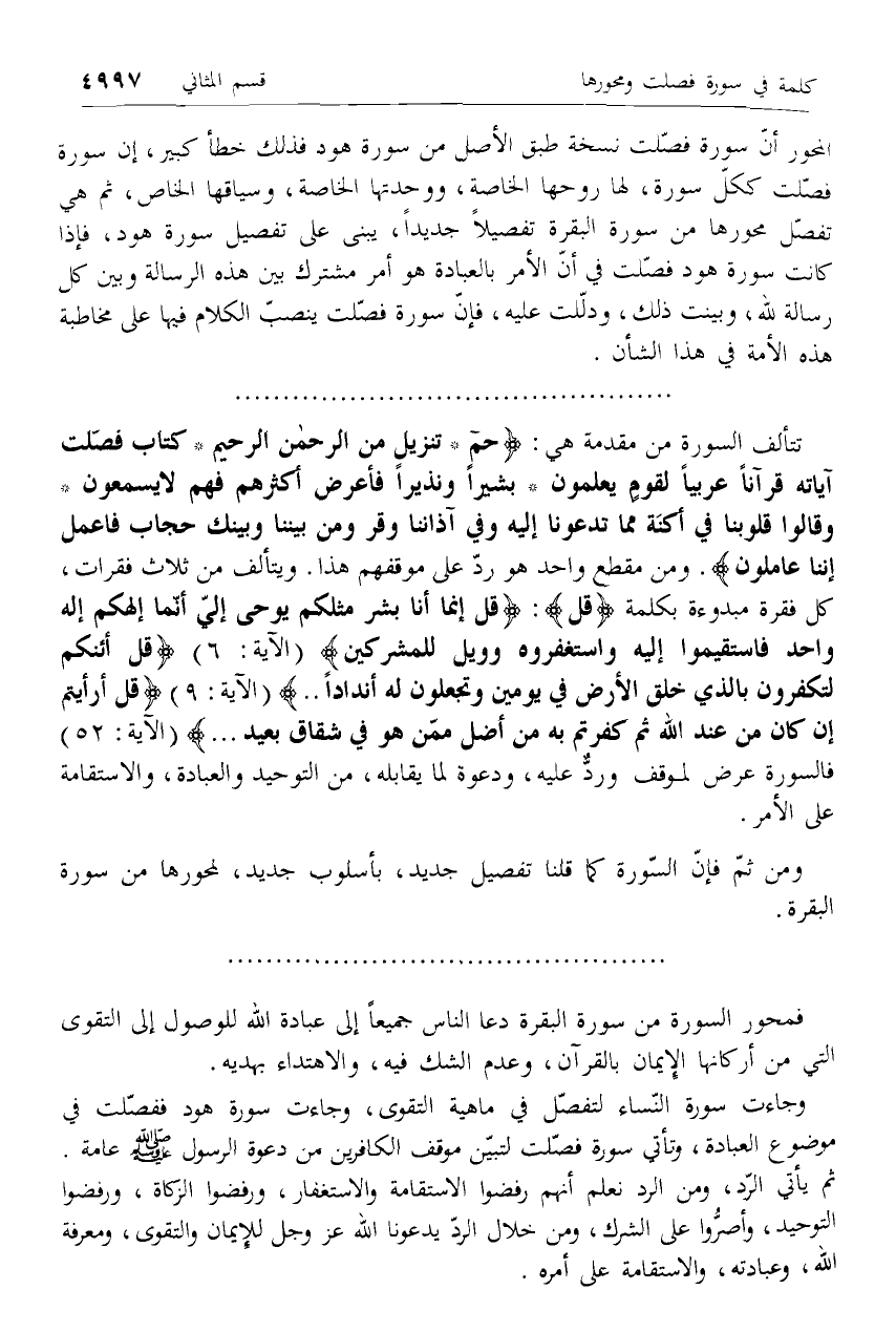 المحور أنّ سورة فصّلت نسخة طبق الأصل من سورة هود فذلك خطأ كبير، إن سورة فصّلت ككلّ سورة، لها روحها الخاصة، ووحدتها الخاصة، وسياقها الخاص، ثم هي تفصّل محورها من سورة البقرة تفصيلا جديدا، يبنى على تفصيل سورة هود، فإذا كانت سورة هود فصّلت في أنّ الأمر بالعبادة هو أمر مشترك بين هذه الرسالة وبين كل رسالة لله، وبينت ذلك، ودلّلت عليه، فإنّ سورة فصّلت ينصبّ الكلام فيها على مخاطبة هذه الأمة في هذا الشأن.