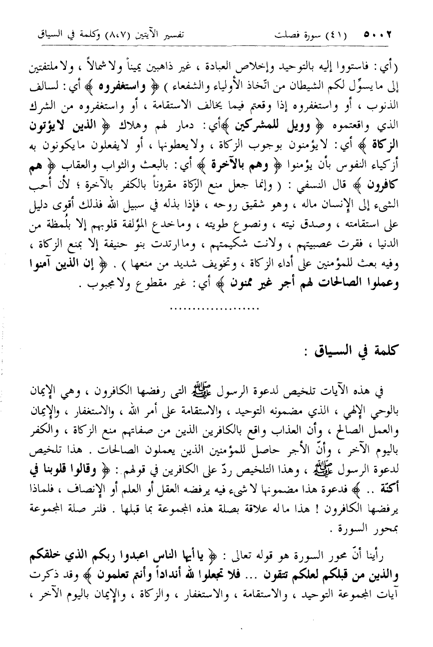 في هذه الآيات تلخيص لدعوة الرسول صلّى الله عليه وسلم التي رفضها الكافرون، وهي الإيمان بالوحي الإلهي، الذي مضمونه التوحيد، والاستقامة على أمر الله، والاستغفار، والإيمان والعمل الصالح، وأن العذاب واقع بالكافرين الذين من صفاتهم منع الزكاة، والكفر باليوم الآخر، وأنّ الأجر حاصل للمؤمنين الذين يعملون الصالحات. هذا تلخيص لدعوة الرسول صلّى الله عليه وسلم، وهذا التلخيص ردّ على الكافرين في قولهم: وَقالُوا قُلُوبُنا فِي أَكِنَّةٍ .. فدعوة هذا مضمونها لا شئ فيه يرفضه العقل أو العلم أو الإنصاف، فلماذا يرفضها الكافرون! هذا ما له علاقة بصلة هذه المجموعة بما قبلها. فلنر صلة المجموعة بمحور السورة.