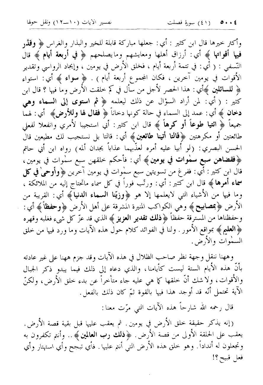 وهاهنا ننقل وجهة نظر صاحب الظلال في هذه الآيات وقد جزم هاهنا على غير عادته بأنّ هذه الأيام الستة ليست كأيامنا، والذي دعاه إلى ذلك فيما يبدو ذكر الجبال والأقوات، ولا شك أنّ خلقها كما هي عليه جاء متأخرا عن بدء خلق الأرض، ولكنّ الآية تحتمل أنّه قد أوجد هذا فيها بالقوة ثمّ كان ذلك بالفعل.