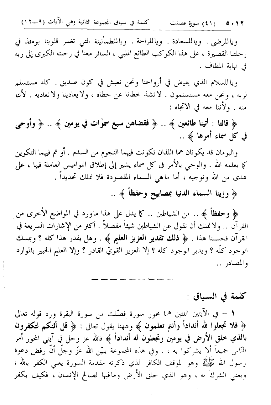 قالَتا: أَتَيْنا طائِعِينَ .. فَقَضاهُنَّ سَبْعَ سَماواتٍ فِي يَوْمَيْنِ .. وَأَوْحى فِي كُلِّ سَماءٍ أَمْرَها ..