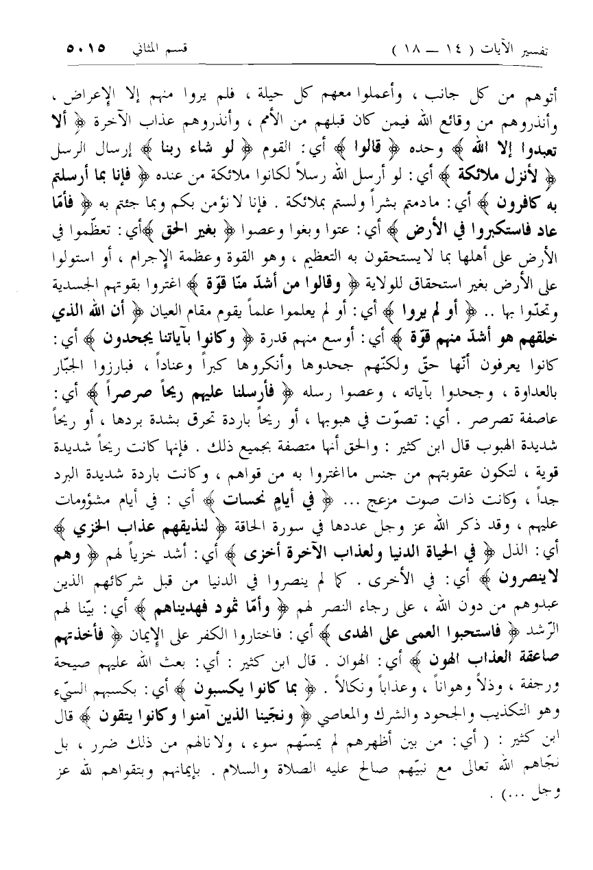 عاصفة تصرصر. أي: تصوّت في هبوبها، أو ريحا باردة تحرق بشدة بردها، أو ريحا شديدة الهبوب قال ابن كثير: والحق أنها متصفة بجميع ذلك. فإنها كانت ريحا شديدة قوية، لتكون عقوبتهم من جنس ما اغتروا به من قواهم، وكانت باردة شديدة البرد جدا، وكانت ذات صوت مزعج ... فِي أَيَّامٍ نَحِساتٍ أي: في أيام مشئومات عليهم، وقد ذكر الله عزّ وجل عددها في سورة الحاقة لِنُذِيقَهُمْ عَذابَ الْخِزْيِ أي: الذل فِي الْحَياةِ الدُّنْيا وَلَعَذابُ الْآخِرَةِ أَخْزى أي: أشد خزيا لهم وَهُمْ لا يُنْصَرُونَ أي: في الأخرى. كما لم ينصروا في الدنيا من قبل شركائهم الذين عبدوهم من دون الله، على رجاء النصر لهم