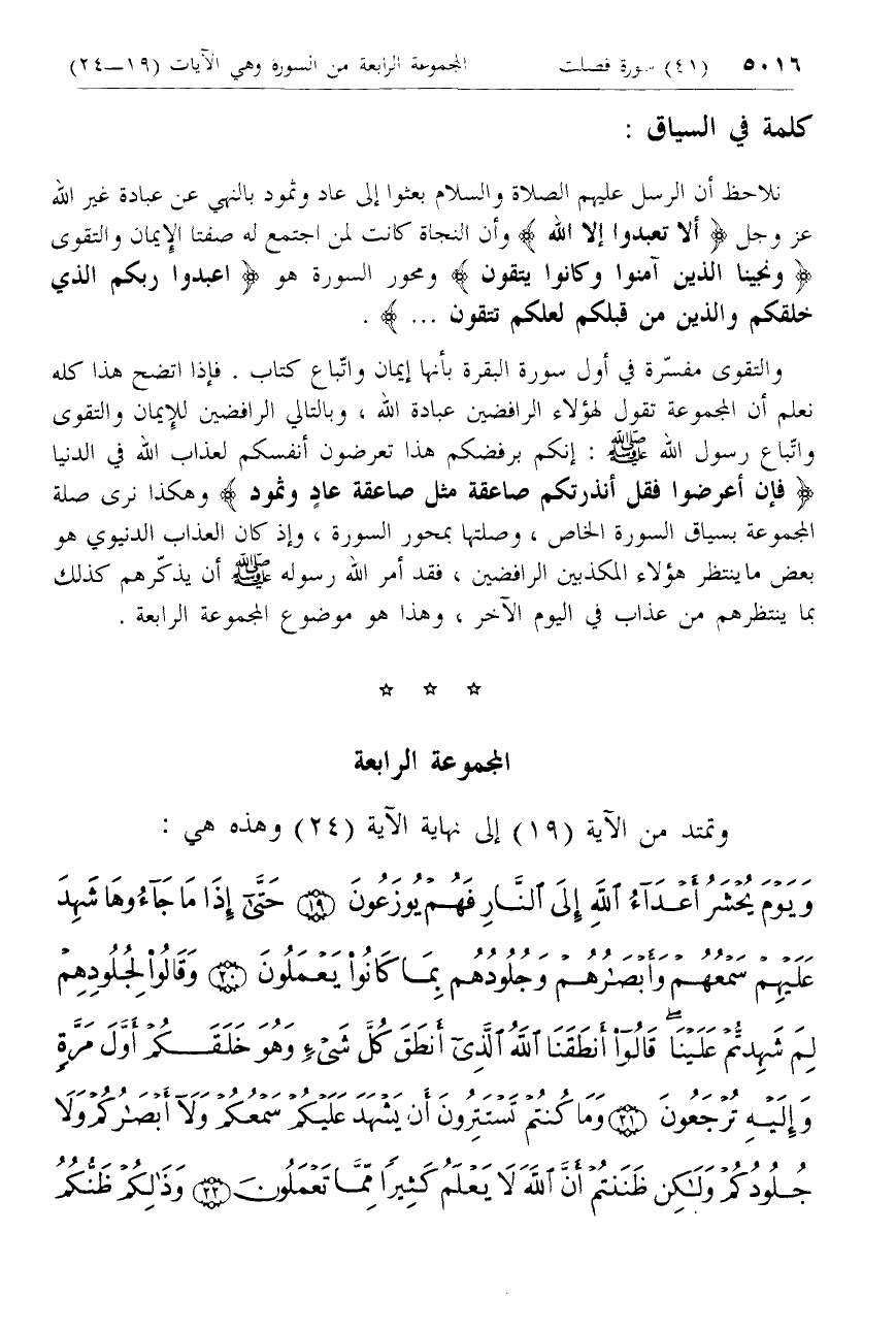 والتقوى واتّباع رسول الله صلّى الله عليه وسلم: إنكم برفضكم هذا تعرضون أنفسكم لعذاب الله في الدنيا فَإِنْ أَعْرَضُوا فَقُلْ أَنْذَرْتُكُمْ صاعِقَةً مِثْلَ صاعِقَةِ عادٍ وَثَمُودَ وهكذا نرى صلة المجموعة بسياق السورة الخاص، وصلتها بمحور السورة، وإذ كان العذاب الدنيوي هو بعض ما ينتظر هؤلاء المكذبين الرافضين، فقد أمر الله رسوله صلّى الله عليه وسلم أن يذكّرهم كذلك بما ينتظرهم من عذاب في اليوم الآخر، وهذا هو موضوع المجموعة الرابعة.